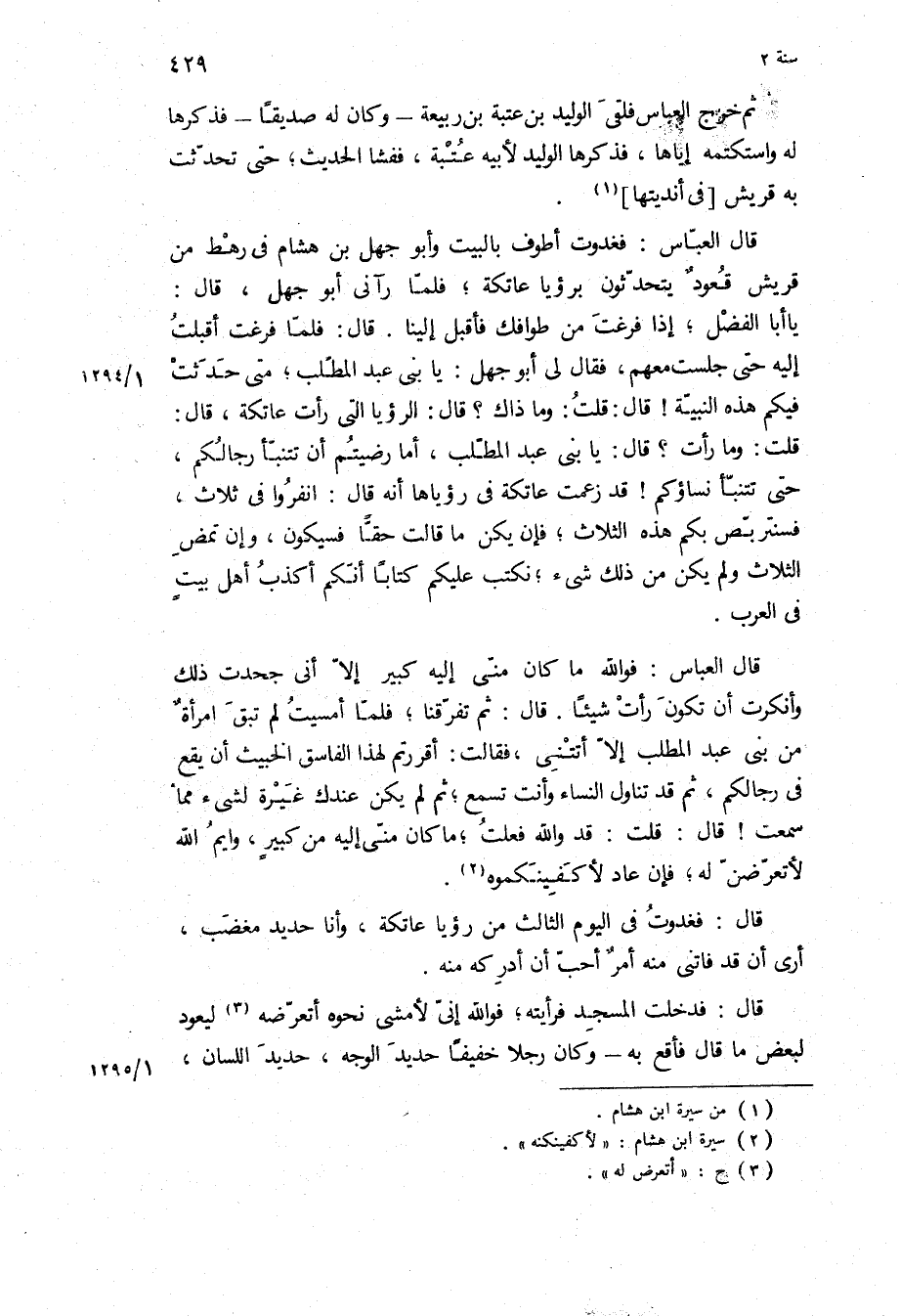 قُلْتُ: وَمَا رَأَتْ؟ قَالَ: يَا بَنِي عَبْدِ الْمُطَّلِبِ، أَمَا رَضِيتُمْ أَنْ تَتَنَبَّأَ رِجَالُكُمْ، حَتَّى تَتَنَبَّأَ نِسَاؤُكُمْ! قَدْ زَعَمَتْ عَاتِكَةُ فِي رُؤْيَاهَا أَنَّهُ قَالَ: انْفِرُوا فِي ثَلَاثٍ، فَسَنَتَرَبَّصُ بِكُمْ هَذِهِ الثَّلاثَ، فَإِنْ يَكُنْ مَا قَالَتْ حَقًّا فَسَيَكُونُ، وَإِنْ تَمْضِ الثَّلاثُ وَلَمْ يَكُنْ مِنْ ذَلِكَ شَيْءٌ، نَكْتُبْ عَلَيْكُمْ كِتَابًا أَنَّكُمْ أَكْذَبُ أَهْلِ بيت في العرب.