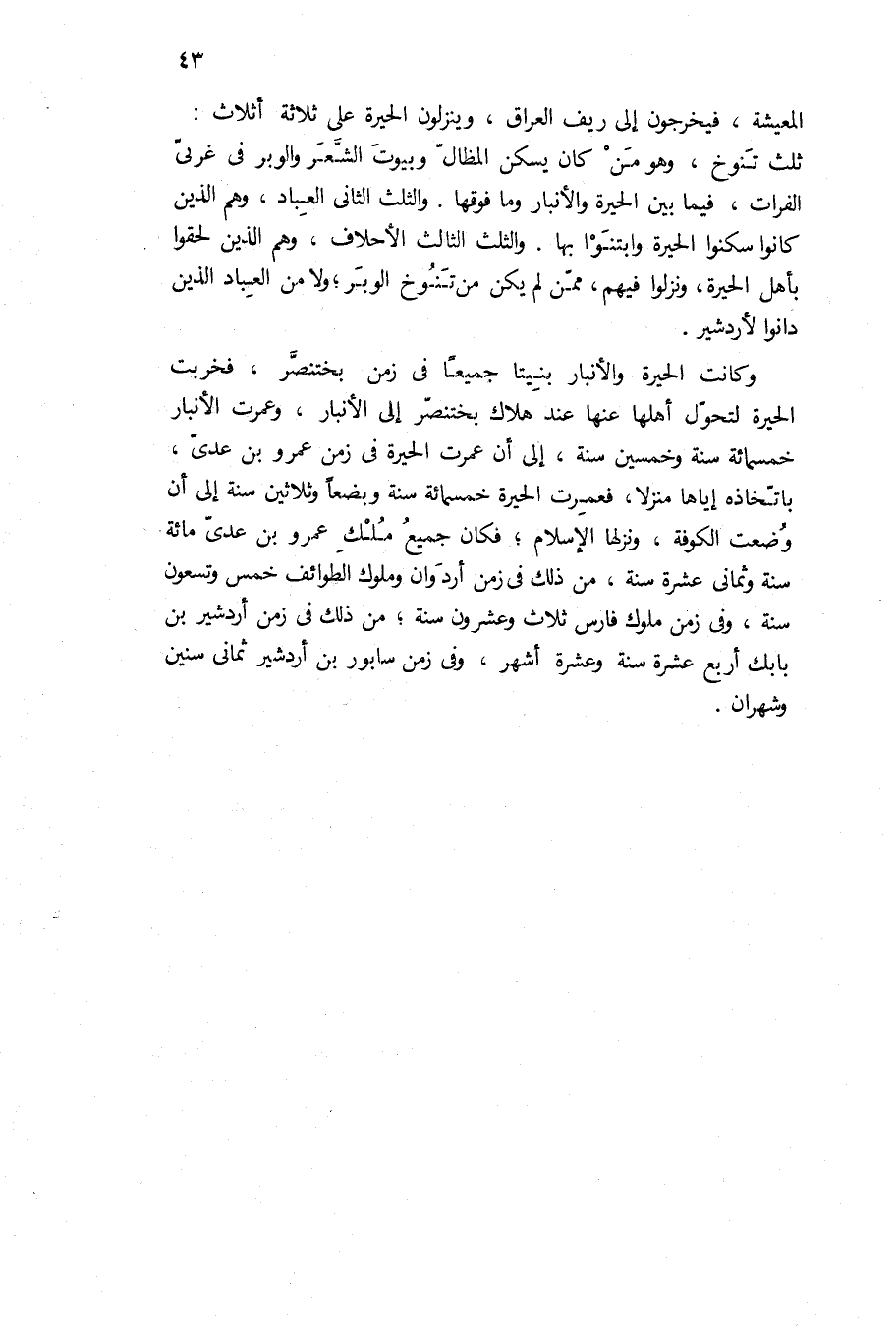 وكانت الحيرة والأنبار بنيتا جميعا في زمن بختنصر فخربت الحيرة لتحول أهلها عنها عند هلاك بختنصر إلى الأنبار، وعمرت الأنبار خمسمائة سنة وخمسين سنة، إلى أن عمرت الحيرة في زمن عمرو بن عدي، باتخاذه إياها منزلا، فعمرت الحيرة خمسمائة سنة وبضعا وثلاثين سنة إلى أن وضعت الكوفة، ونزلها الإسلام، فكان جميع ملك عمرو بن عدي مائة سنة وثماني عشرة سنة، من ذلك في زمن أردوان وملوك الطوائف خمس وتسعون سنة، وفي زمن ملوك فارس ثلاث وعشرون سنة، من ذلك في زمن أردشير بن بابك أربع عشرة سنة وعشرة أشهر، وفي زمن سابور بن أردشير ثماني سنين وشهران
