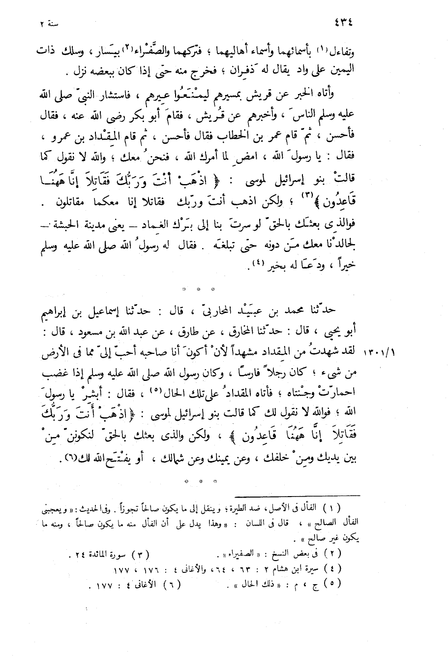 وأتاه الخبر عن قريش بمسيرهم ليمنعوا عيرهم، فاستشار النبي ص الناس، وأخبرهم عن قريش، فقام أبو بكر رضي الله عنه، فقال فأحسن، ثم قام عمر بن الخطاب فقال فأحسن، ثم قام المقداد بن عمرو، فقال: يا رسول الله، امض لما أمرك الله، فنحن معك، والله لا نقول كما قالت بنو إسرائيل لموسى: «اذهب أَنْتَ وَرَبُّكَ فَقاتِلا إِنَّا هاهُنا قاعِدُونَ» ، ولكن اذهب أنت وربك فقاتلا إنا معكما مقاتلون.