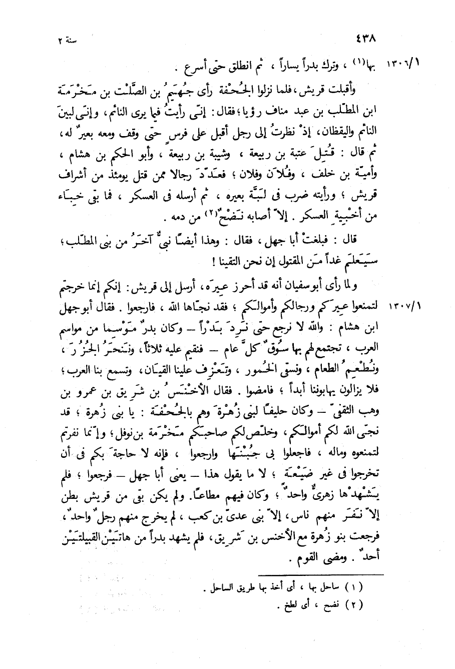 وَأَقْبَلَتْ قُرَيْشٌ، فَلَمَّا نَزَلُوا الْجُحْفَةَ رَأَى جهيم بن الصلت بن مخرمه ابن الْمُطَّلِبِ بْنِ عَبْدِ مَنَافٍ رُؤْيَا، فَقَالَ: إِنِّي رَأَيْتُ فِيمَا يَرَى النَّائِمُ، وَإِنِّي لَبَيْنَ النَّائِمِ وَالْيَقْظَانِ، إِذْ نَظَرْتُ إِلَى رَجُلٍ أَقْبَلَ عَلَى فَرَسٍ حَتَّى وَقَفَ وَمَعَهُ بَعِيرٌ لَهُ، ثُمَّ قال: قتل عتبة بن ربيعة، وشيبة بن ربيعة، وأبو الحكم بن هشام، وأمية بن خَلَفٍ، وَفُلَانٌ وَفُلَانٌ، فَعَدَّدَ رِجَالًا مِمَّنْ قُتِلَ يَوْمَئِذٍ مِنْ أَشْرَافِ قُرَيْشٍ، وَرَأَيْتُهُ ضَرَبَ فِي لَبَّةِ بَعِيرِهِ، ثُمَّ أَرْسَلَهُ فِي الْعَسْكَرِ، فَمَا بَقِيَ خِبَاءٌ مِنْ أَخْبِيَةِ الْعَسْكَرِ إِلَّا أَصَابَهُ نَضْحٌ مِنْ دَمِهِ قَالَ: فَبَلَغَتْ أَبَا جَهْلٍ، فَقَالَ: وَهَذَا أَيْضًا نَبِيٌّ آخَرُ مِنْ بَنِي الْمُطَّلِبِ، سَيُعْلَمُ غَدًا مَنِ الْمَقْتُولُ إِنْ نَحْنُ الْتَقَيْنَا! وَلَمَّا رَأَى أَبُو سُفْيَانَ أَنَّهُ قَدْ أَحْرَزَ عِيرَهُ، أَرْسَلَ إِلَى قُرَيْشٍ: إِنَّكُمْ إِنَّمَا خَرَجْتُمْ لِتَمْنَعُوا عِيرَكُمْ وَرِجَالَكُمْ وَأَمْوَالَكُمْ، فَقَدْ نَجَّاهَا الله، فارجعوا فقال ابو جهل ابن هِشَامٍ: وَاللَّهِ لا نَرْجِعُ حَتَّى نَرِدَّ بَدْرًا- وَكَانَ بَدْرٌ مَوْسِمًا مِنْ مَوَاسِمِ الْعَرَبِ، تَجْتَمِعُ لَهُمْ بِهَا سُوقٌ كُلَّ عَامٍ- فَنُقِيمُ عَلَيْهِ ثَلَاثًا، وَنَنْحَرَ الْجُزُرَ، وَنُطْعِمُ الطَّعَامَ، وَنُسْقِيَ الْخُمُورَ، وَتَعْزِفَ عَلَيْنَا الْقِيَانُ، وَتَسْمَعُ بِنَا الْعَرَبُ، فَلا يَزَالُونَ يَهَابُونَنَا أَبَدًا، فَامْضُوا فَقَالَ الأَخْنَسُ بْنُ شَرِيقِ بْنِ عَمْرِو بْنِ وَهْبٍ الثَّقَفِيُّ- وَكَانَ حَلِيفًا لِبَنِي زُهْرَةَ وَهُمْ بِالْجُحْفَةِ: يَا بَنِي زُهْرَةَ، قَدْ نَجَّى اللَّهُ لَكُمْ أَمْوَالَكُمْ، وَخَلَّصَ لَكُمْ صَاحِبَكُمْ مَخْرَمَةَ بْنَ نَوْفَلٍ، وَإِنَّمَا نَفَرْتُمْ لِتَمْنَعُوهُ وَمَالَهُ، فَاجْعَلُوا بِي جبنها وَارْجِعُوا، فَإِنَّهُ لا حَاجَةَ بِكُمْ فِي أَنْ تَخْرُجُوا فِي غَيْرِ ضَيْعَةٍ، لا مَا يَقُولُ هَذَا- يَعْنِي أَبَا جَهْلٍ- فَرَجَعُوا، فَلَمْ يَشْهَدْهَا زُهْرِيٌّ وَاحِدٌ، وَكَانَ فِيهِمْ مُطَاعًا وَلَمْ يَكُنْ بَقِيَ مِنْ قُرَيْشٍ بَطْنٌ إِلَّا نَفَرَ مِنْهُمْ نَاسٌ، إِلَّا بَنِي عَدِيِّ بْنِ كَعْبٍ، لَمْ يَخْرُجْ مِنْهُمْ رَجُلٌ وَاحِدٌ، فَرَجَعَتْ بَنُو زُهْرَةَ مَعَ الأَخْنَسِ بْنِ شَرِيقٍ، فَلَمْ يَشْهَدْ بَدْرًا مِنْ هَاتَيْنِ الْقَبِيلَتَيْنِ أَحَدٌ وَمَضَى الْقَوْمُ