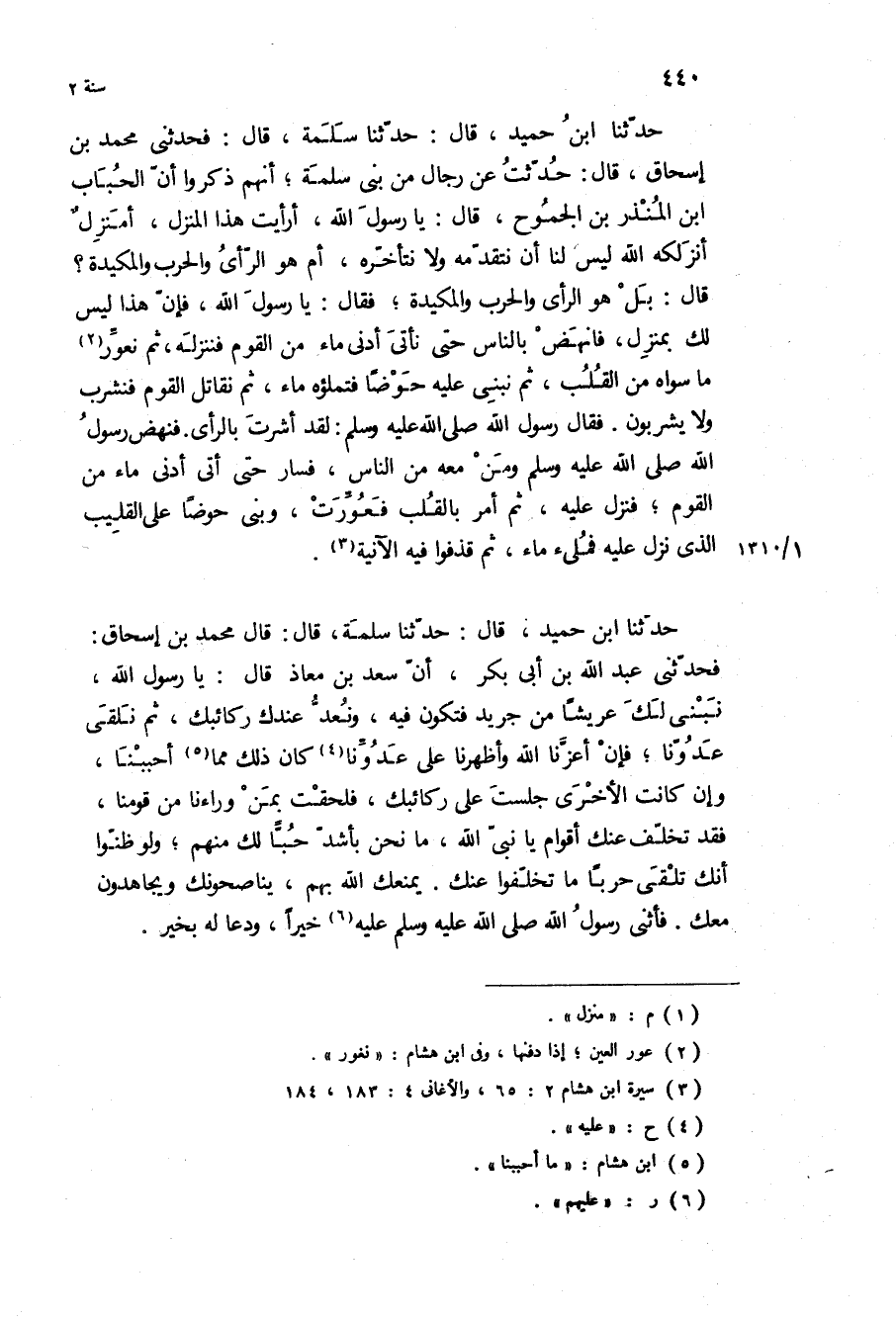 حدثنا ابن حميد، قال: حدثنا سلمة، قال: فَحَدَّثَنِي مُحَمَّدُ بْنُ إِسْحَاقَ، قَالَ: حُدِّثْتُ عَنْ رِجَالٍ مِنْ بَنِي سَلَمَةَ، أَنَّهُمْ ذَكَرُوا أَنَّ الحباب ابن الْمُنْذِرِ بْنِ الْجَمُوحِ، قَالَ: يَا رَسُولَ اللَّهِ، أَرَأَيْتَ هَذَا الْمَنْزِلَ، أَمَنْزِلٌ أَنْزَلَكَهُ اللَّهُ لَيْسَ لَنَا أَنْ نَتَقَدَّمَهُ وَلا نَتَأَخَّرَهُ، أَمْ هُوَ الرَّأْيُ وَالْحَرْبُ وَالْمَكِيدَةُ؟