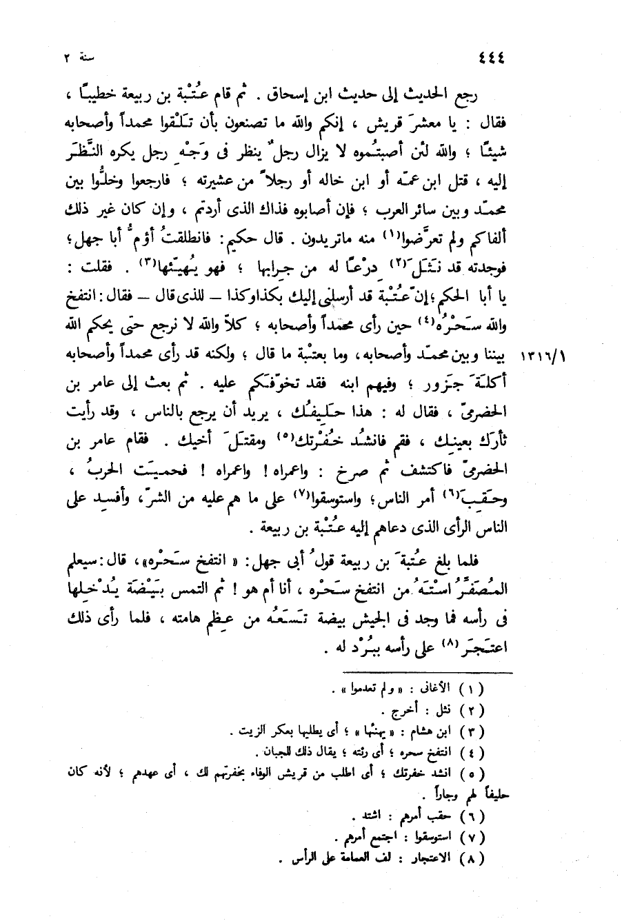 فلما بلغ عتبة بن ربيعة قول أبي جهل: انتفخ سحره، قال: سيعلم المصفر استه من انتفخ سحره، أنا أم هو! ثم التمس بيضة يدخلها في رأسه فما وجد في الجيش بيضة تسعه من عظم هامته، فلما رأى ذلك اعتجر على رأسه ببرد له