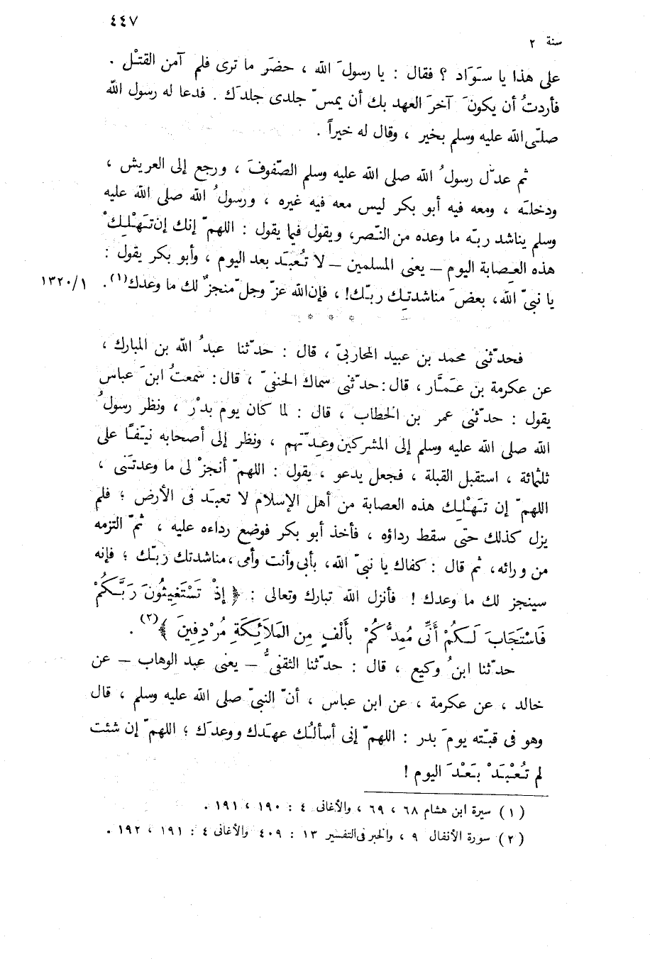 فَحَدَّثَنِي مُحَمَّدُ بْنُ عُبَيْدٍ الْمُحَارِبِيُّ، قَالَ: حَدَّثَنَا عَبْدُ اللَّهِ بْنُ الْمُبَارَكِ، عَنْ عِكْرِمَةَ بْنِ عَمَّارٍ، قَالَ: حَدَّثَنِي سِمَاكٌ الْحَنَفِيُّ، قَالَ: سَمِعْتُ ابْنَ عَبَّاسٍ يَقُولُ: حَدَّثَنِي عُمَرُ بْنُ الْخَطَّابِ، قَالَ: لَمَّا كَانَ يوم بدر، ونظر رسول الله ص إِلَى الْمُشْرِكِينَ وَعِدَّتِهِمْ، وَنَظَرَ إِلَى أَصْحَابِهِ نَيِّفًا على ثلاثمائة، اسْتَقْبَلَ الْقِبْلَةَ، فَجَعَلَ يَدْعُو، يَقُولُ: اللَّهُمَّ أَنْجِزْ لِي مَا وَعَدْتَنِي، اللَّهُمَّ إِنْ تَهْلَكْ هَذِهِ الْعِصَابَةُ مِنْ أَهْلِ الإِسْلامِ لا تُعْبَدُ فِي الأَرْضِ، فَلَمْ يَزَلْ كَذَلِكَ حَتَّى سَقَطَ رِدَاؤُهُ، فَأَخَذَ أَبُو بَكْرٍ فَوَضَعَ رِدَاءَهُ عَلَيْهِ، ثُمَّ الْتَزَمَهُ مِنْ وَرَائِهِ، ثُمَّ قَالَ: كَفَاكَ يَا نبى الله، بابى وأنت وَأُمِّي، مُنَاشَدَتَكَ رَبَّكَ، فَإِنَّهُ سَيُنْجِزُ لَكَ مَا وَعَدَكَ! فَأَنْزَلَ اللَّهُ تَبَارَكَ وَتعالى: «إِذْ تَسْتَغِيثُونَ رَبَّكُمْ فَاسْتَجابَ لَكُمْ أَنِّي مُمِدُّكُمْ بِأَلْفٍ مِنَ الْمَلائِكَةِ مُرْدِفِينَ» .
