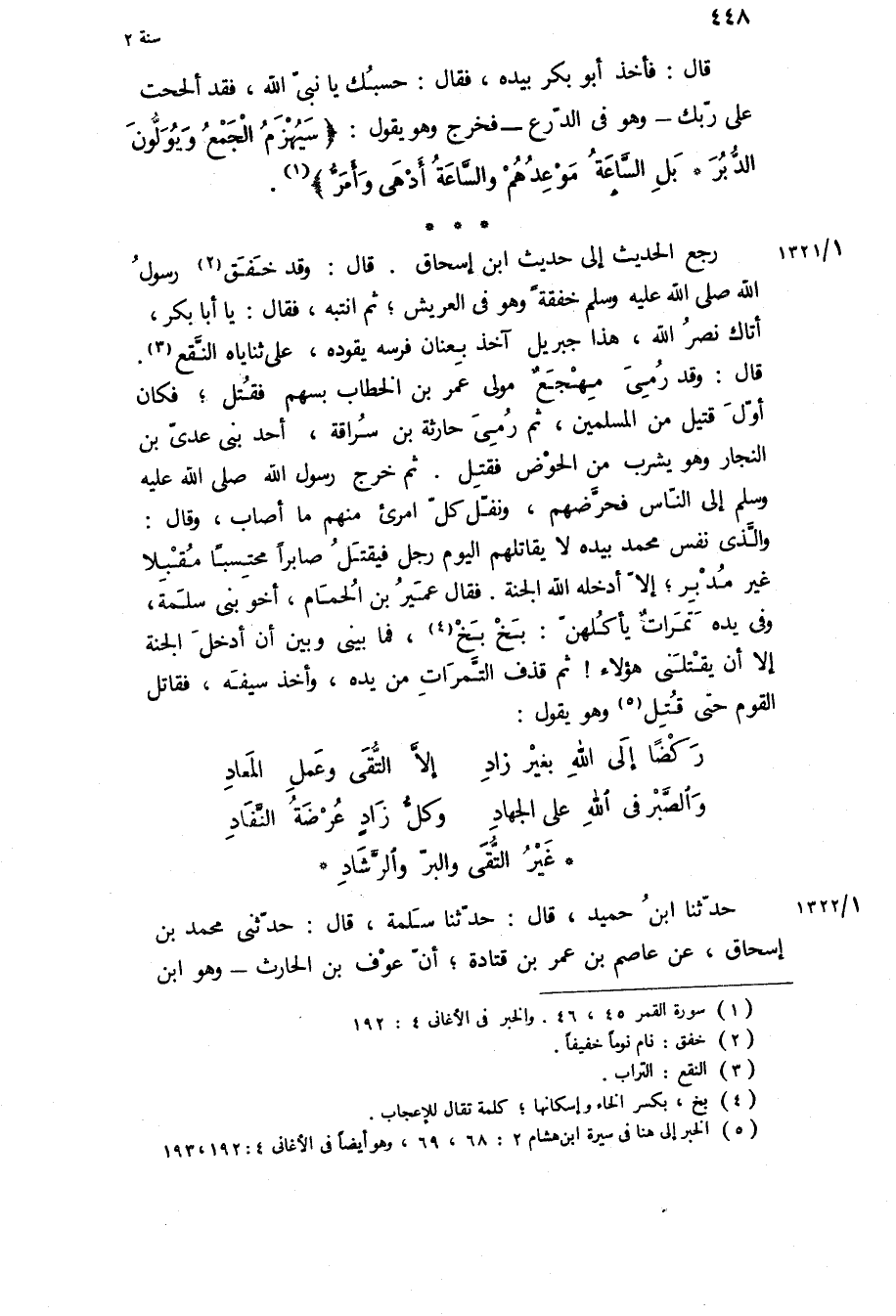 قَالَ: فَأَخَذَ أَبُو بَكْرٍ بِيَدِهِ، فَقَالَ: حَسْبُكَ يَا نَبِيَّ اللَّهِ، فَقَدْ أَلْحَحْتَ عَلَى رَبِّكَ- وَهُوَ فِي الدِّرْعِ- فَخَرَجَ وَهُوَ يَقُولُ: «سَيُهْزَمُ الْجَمْعُ وَيُوَلُّونَ الدُّبُرَ بَلِ السَّاعَةُ مَوْعِدُهُمْ وَالسَّاعَةُ أَدْهى وَأَمَرُّ» .