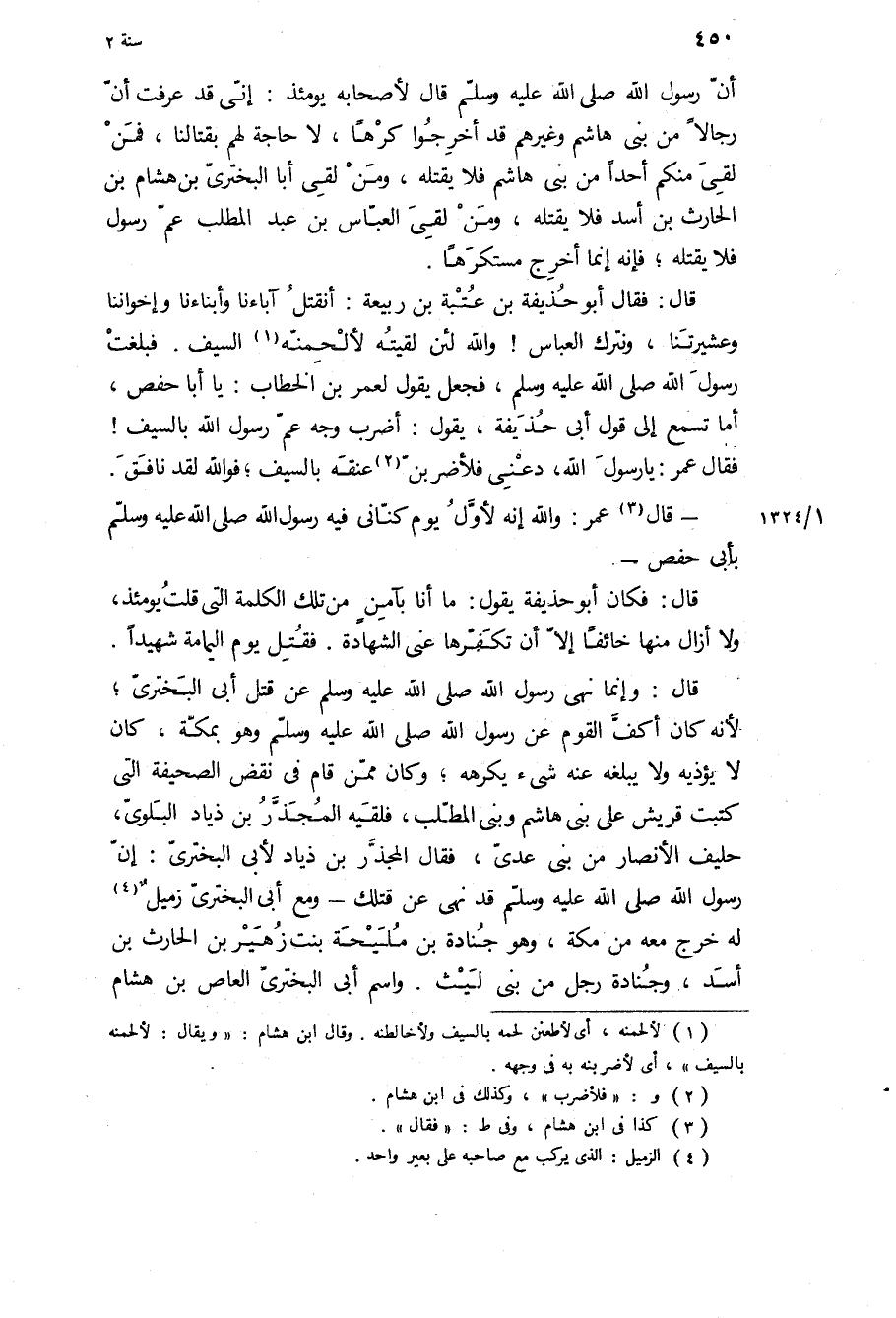 [ان رسول الله ص قَالَ لأَصْحَابِهِ يَوْمَئِذٍ: إِنِّي قَدْ عَرَفْتُ أَنَّ رِجَالا مِنْ بَنِي هَاشِمٍ وَغَيْرِهِمْ قَدْ أُخْرِجُوا كَرْهًا، لا حَاجَةَ لَهُمْ بِقِتَالِنَا، فَمَنْ لَقِيَ مِنْكُمْ أَحَدًا مِنْ بَنِي هَاشِمٍ فَلا يَقْتُلُهُ، وَمَنْ لَقِيَ أَبَا الْبَخْتَرِيِّ بْن هِشَامِ بْنِ الْحَارِثِ بْنِ أَسَدٍ فَلا يَقْتُلُهُ، وَمَنْ لَقِيَ العباس بن عبد المطلب عم رسول فَلا يَقْتُلُهُ، فَإِنَّهُ إِنَّمَا أُخْرِجَ مُسْتَكْرِهًا] قَالَ: فَقَالَ أَبُو حُذَيْفَةَ بْنُ عُتْبَةَ بْنِ رَبِيعَةَ: أَنَقْتُلُ آبَاءَنَا وَأَبْنَاءَنَا وَإِخْوَانَنَا وَعَشِيرَتَنَا، وَنَتْرُكُ الْعَبَّاسَ! وَاللَّهِ لَئِنْ لَقِيتُهُ لأَلْحِمَنَّهُ السَّيْفَ فَبَلَغَتْ رَسُولَ الله ص، فَجَعَلَ يَقُولُ لِعُمَرَ بْنِ الْخَطَّابِ: يَا أَبَا حَفْصٍ، أَمَا تَسْمَعُ إِلَى قَوْلِ أَبِي حُذَيْفَةَ، يقول: اضرب وجه عم رسول الله بِالسَّيْفِ! فَقَالَ عُمَرُ: يَا رَسُولَ اللَّهِ، دَعْنِي فلاضربن عنقه بالسيف، فو الله لقد نافق.