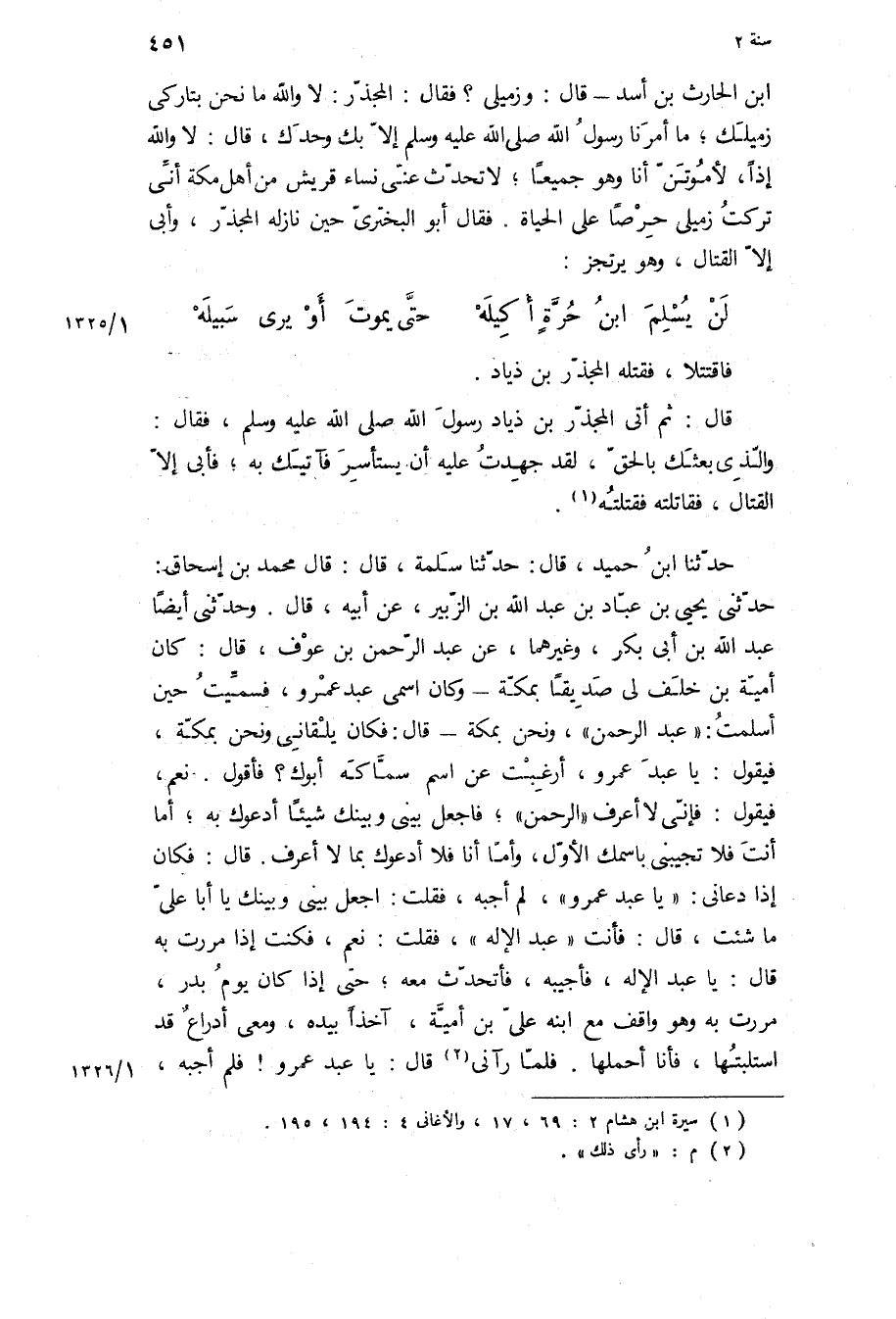 ابن الْحَارِثِ بْنِ أَسَدٍ- قَالَ: وَزَمِيلِي؟ فَقَالَ: الْمِجْذَرُ: لا وَاللَّهِ مَا نَحْنُ بِتَارِكِي زَمِيلِكَ، مَا امرنا رسول الله ص إِلا بِكَ وَحْدَكَ، قَالَ: لا وَاللَّهِ إِذًا، لأَمُوتَنَّ أَنَا وَهُوَ جَمِيعًا، لا تُحَدِّثُ عَنِّي نِسَاءُ قُرَيْشٍ مِنْ أَهْلِ مَكَّةَ أَنِّي تَرَكْتُ زَمِيلِي حِرْصًا عَلَى الْحَيَاةِ فَقَالَ أَبُو الْبَخْتَرِيِّ حِينَ نَازَلَهُ الْمِجْذَرُ، وَأَبَى إِلا الْقِتَالَ، وَهُوَ يَرْتَجِزُ: