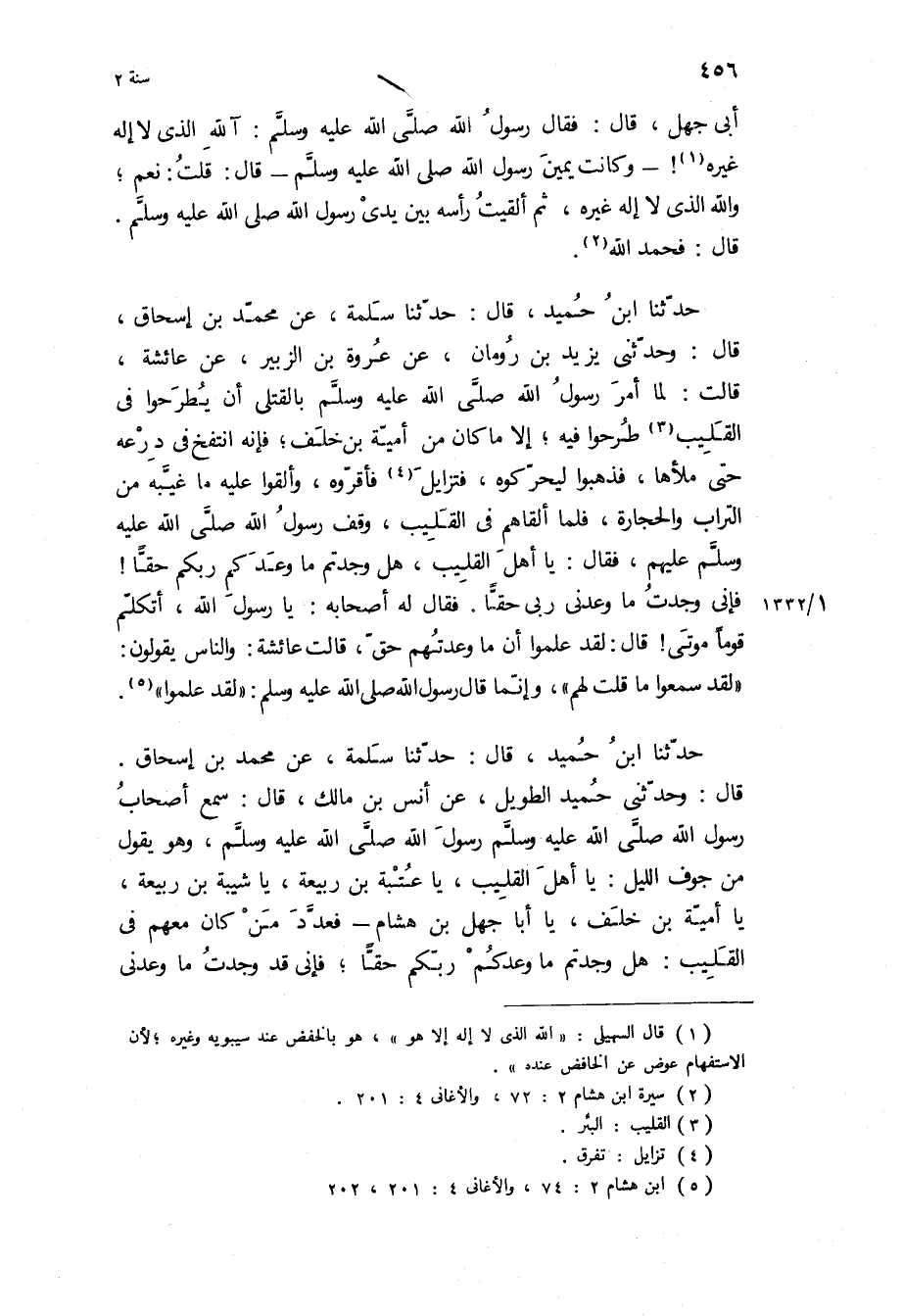 حَدَّثَنَا ابْنُ حُمَيْدٍ، قَالَ: حَدَّثَنَا سلمة، عن محمد بن إسحاق، قال: وحدثني يَزِيدَ بْنِ رُومَانَ، عَنْ عُرْوَةَ بْنِ الزُّبَيْرِ، عَنْ عَائِشَةَ، قَالَتْ: لَمَّا أَمَرَ رَسُولُ الله ص بِالْقَتْلَى أَنْ يُطْرَحُوا فِي الْقَلِيبِ طُرِحُوا فِيهِ، إِلا مَا كَانَ مِنْ أُمَيَّةَ بْنِ خَلَفٍ، فَإِنَّهُ انْتَفَخَ فِي دِرْعِهِ حَتَّى مَلأَهَا، فَذَهَبُوا لِيُحَرِّكُوهُ، فَتَزَايَلَ فَأَقَرُّوهُ، وَأَلْقَوْا عَلَيْهِ مَا غَيَّبَهُ مِنَ التُّرَابِ وَالْحِجَارَةِ، فَلَمَّا أَلْقَاهُمْ فِي الْقَلِيبِ، وقف رسول الله ص عليهم، [فَقَالَ: يَا أَهْلَ الْقَلِيبِ، هَلْ وَجَدْتُمْ مَا وَعَدَكُمْ رَبُّكُمْ حَقًّا! فَإِنِّي وَجَدْتُ مَا وَعَدَنِي رَبِّي حَقًّا فَقَالَ لَهُ أَصْحَابُهُ: يَا رَسُولَ اللَّهِ، أَتُكَلِّمُ قَوْمًا مَوْتَى! قَالَ: لَقَدْ عَلِمُوا أَنَّ مَا وَعَدْتُهُمْ حَقٌّ، قَالَتْ عَائِشَةُ: وَالنَّاسُ يَقُولُونَ: