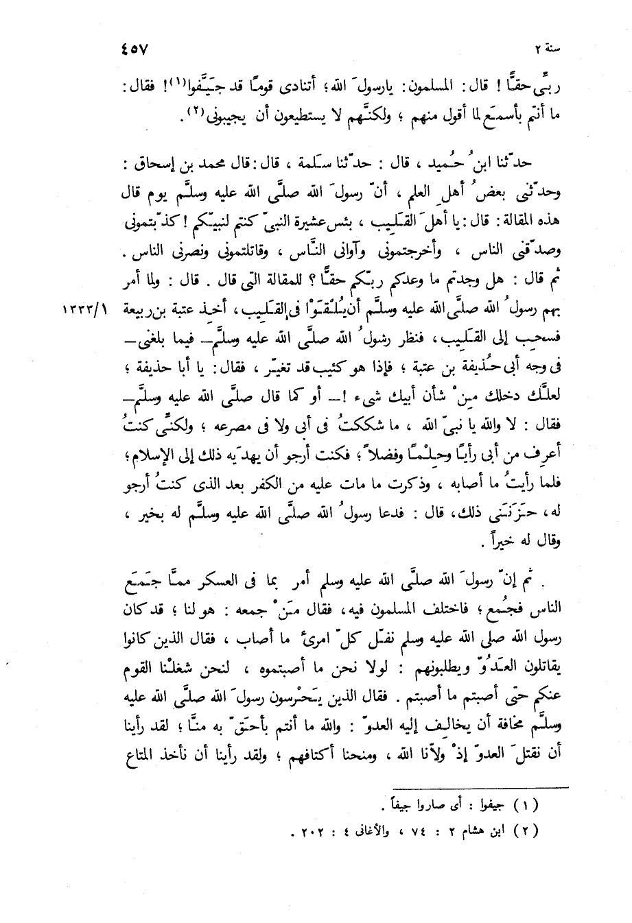 ثُمَّ قَالَ: هَلْ وَجَدْتُمْ مَا وَعَدَكُمْ رَبُّكُمْ حَقًّا؟ لِلْمَقَالَةِ الَّتِي قَالَ] قَالَ: وَلَمَّا امر بهم رسول الله ص أَنْ يُلْقُوا فِي الْقَلِيبِ، أُخِذَ عُتْبَةُ بْنُ رَبِيعَةَ فَسُحِبَ إِلَى الْقَلِيبِ، فَنَظَرَ رَسُولُ اللَّهِ ص- فِيمَا بَلَغَنِي- فِي وَجْهِ أَبِي حُذَيْفَةَ بْنِ عُتْبَةَ، فَإِذَا هُوَ كَئِيبٌ قَدْ تَغَيَّرَ، فَقَالَ: يَا أَبَا حُذَيْفَةَ، لَعَلَّكَ دَخَلَكَ مِنْ شَأْنِ ابيك شيء! - او كما قال ص- فقال: لا وَاللَّهِ يَا نَبِيَّ اللَّهِ، مَا شَكَكْتُ فِي أَبِي وَلا فِي مَصْرَعِهِ، وَلَكِنِّي كُنْتُ أَعْرِفُ مِنْ أَبِي رَأْيًا وَحِلْمًا وَفَضْلًا، فَكُنْتُ أَرْجُو أَنْ يَهْدِيَهُ ذَلِكَ إِلَى الإِسْلامِ، فَلَمَّا رَأَيْتُ مَا أَصَابَهُ، وَذَكَرْتُ مَا مَاتَ عَلَيْهِ مِنَ الْكُفْرِ بَعْدَ الَّذِي كُنْتُ أَرْجُو لَهُ، حزننى ذلك، قال: فدعا رسول الله ص لَهُ بِخَيْرٍ، وَقَالَ لَهُ خَيْرًا.