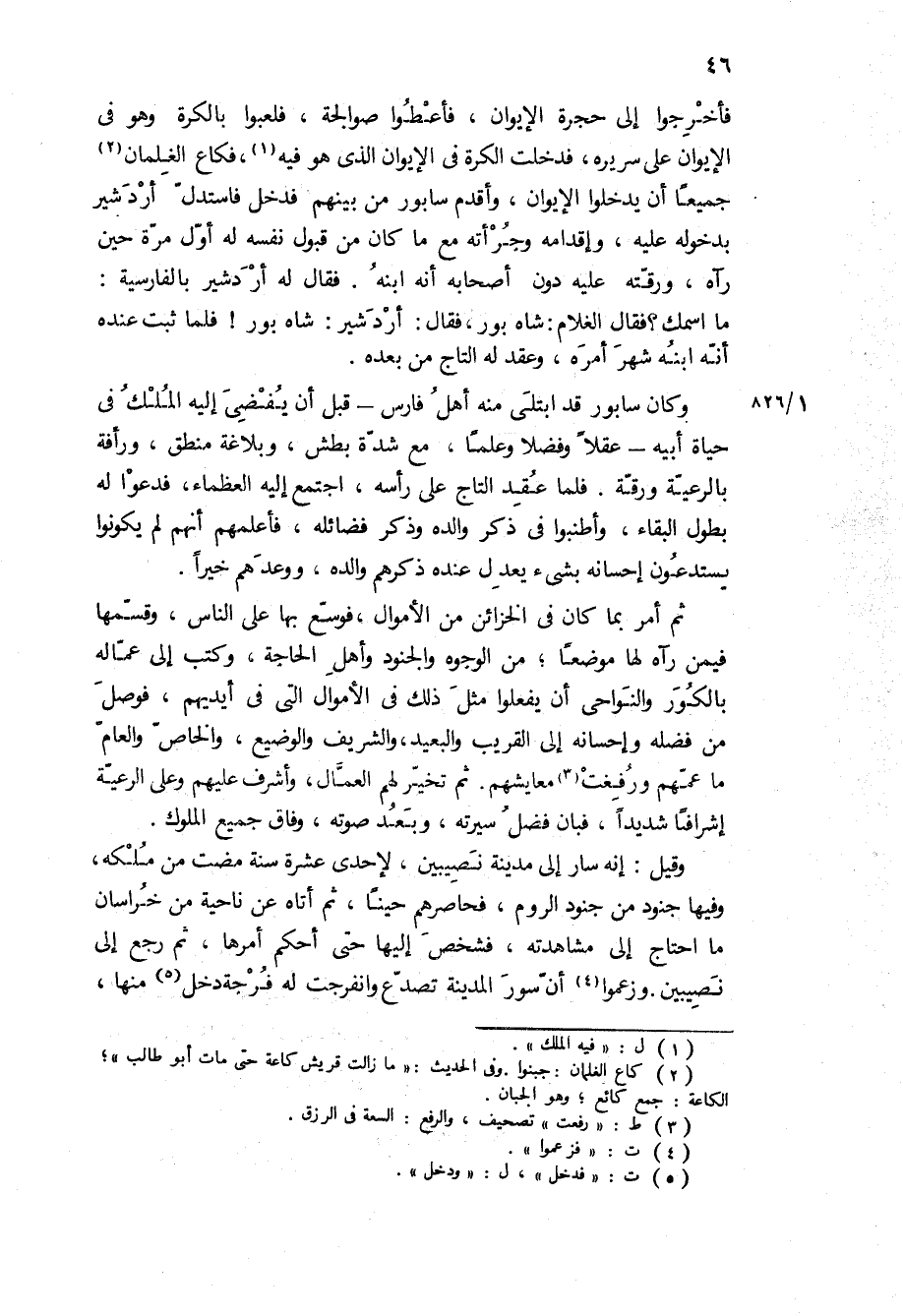 فأخرجوا إلى حجرة الإيوان، فأعطوا صوالجة، فلعبوا بالكرة وهو في الإيوان على سريره، فدخلت الكرة في الإيوان الذي هو فيه، فكاع الغلمان جميعا أن يدخلوا الإيوان، وأقدم سابور من بينهم فدخل فاستدل أردشير بدخوله عليه، وإقدامه وجرأته مع ما كان من قبول نفسه له أول مرة حين رآه، ورقته عليه دون أصحابه أنه ابنه فقال له أردشير بالفارسية: