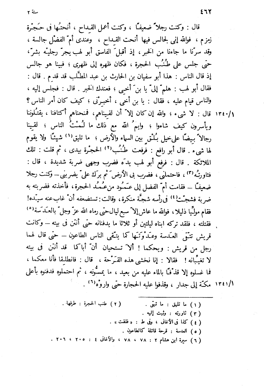 فَثَاوَرْتُهُ، فَاحْتَمَلَنِي، فَضَرَبَ بِي الأَرْضَ ثُمَّ بَرَكَ عَلَيَّ يَضْرِبُنِي- وَكُنْتُ رَجُلا ضَعِيفًا- فَقَامَتْ أُمُّ الْفَضْلِ إِلَى عَمُودٍ مِنْ عُمُدِ الْحُجْرَةِ، فَأَخَذَتْهُ فَضَرَبَتْهُ بِهِ ضَرْبَةً فَشَجَّتْ فِي رَأْسِهِ شَجَّةً مُنْكَرَةً، وَقَالَتْ: تَسْتَضْعِفُهُ أَنْ غَابَ عنه سيده! فقام موليا ذليلا، فو الله مَا عَاشَ إِلا سَبْعَ لَيَالٍ حَتَّى رَمَاهُ اللَّهُ عَزَّ وَجَلَّ بِالْعَدَسَةِ فَقَتَلَتْهُ، فَلَقَدْ تَرَكَهُ ابْنَاهُ لَيْلَتَيْنِ أَوْ ثَلاثًا مَا يَدْفِنَانِهِ حَتَّى أَنْتَنَ فِي بَيْتِهِ- وَكَانَتْ قُرَيْشٌ تَتَّقِي الْعَدَسَةَ وَعَدْوَتَهَا كَمَا يَتَّقِي النَّاسُ الطَّاعُونَ- حَتَّى قَالَ لَهُمَا رَجُلٌ مِنْ قُرَيْشٍ: وَيْحَكُمَا! أَلا تَسْتَحِيَانِ أَنَّ أَبَاكُمَا قَدْ أَنْتَنَ فِي بَيْتِهِ لا تُغَيِّبَانِهِ! فَقَالا: إِنَّا نَخْشَى هَذِهِ الْقُرْحَةَ، قَالَ: فَانْطَلِقَا فَأَنَا مَعَكُمَا، فَمَا غَسَّلُوهُ إِلا قَذْفًا بِالْمَاءِ عَلَيْهِ مِنْ بَعِيدٍ، مَا يَمَسُّونَهُ، ثُمَّ احْتَمَلُوهُ فَدَفَنُوهُ بِأَعْلَى مَكَّةَ إِلَى جِدَارٍ، وَقَذَفُوا عَلَيْهِ الْحِجَارَةَ حَتَّى وَارَوْهُ