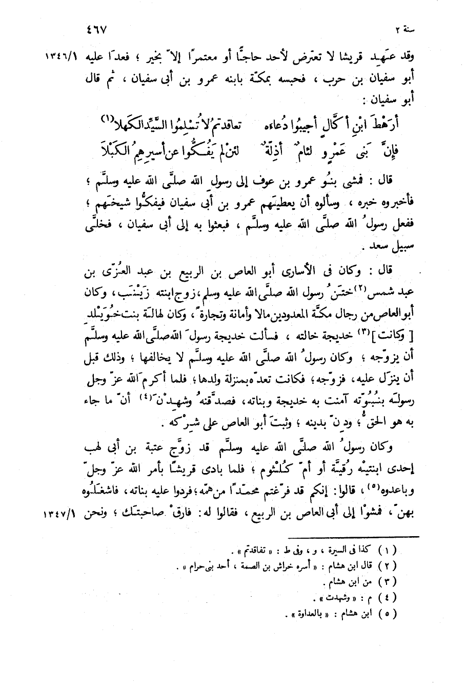 قَالَ: وَكَانَ فِي الأُسَارَى أَبُو الْعَاصِ بْنُ الرَّبِيعِ بْنِ عَبْدِ الْعُزَّى بْنِ عَبْدِ شمس ختن رسول الله ص، زَوْجُ ابْنَتِهِ زَيْنَبَ، وَكَانَ أَبُو الْعَاصِ مِنْ رِجَالِ مَكَّةَ الْمَعْدُودِينَ مَالًا وَأَمَانَةً وَتِجَارَةً، وَكَانَ لِهَالَةَ بِنْتِ خُوَيْلِدٍ وَكَانَتْ خَدِيجَةُ خَالَتَهُ، فَسَأَلَتْ خديجه رسول الله ص ان يزوجه، وكان رسول الله ص لا يُخَالِفُهَا، وَذَلِكَ قَبْلَ أَنْ يُنَزَّلَ عَلَيْهِ، فَزَوَّجَهُ، فَكَانَتْ تُعِدُّهُ بِمَنْزِلَةِ وَلَدِهَا، فَلَمَّا أَكْرَمَ اللَّهُ عَزَّ وَجَلَّ رَسُولَهُ بِنُبُوَّتِهِ آمَنَتْ بِهِ خَدِيجَةُ وَبَنَاتُهُ، فَصَدَّقْنَهُ وَشَهِدْنَ أَنَّ مَا جَاءَ بِهِ هُوَ الْحَقُّ، وَدِنَّ بِدِينِهِ، وَثَبَتَ أَبُو العاص على شركه.
