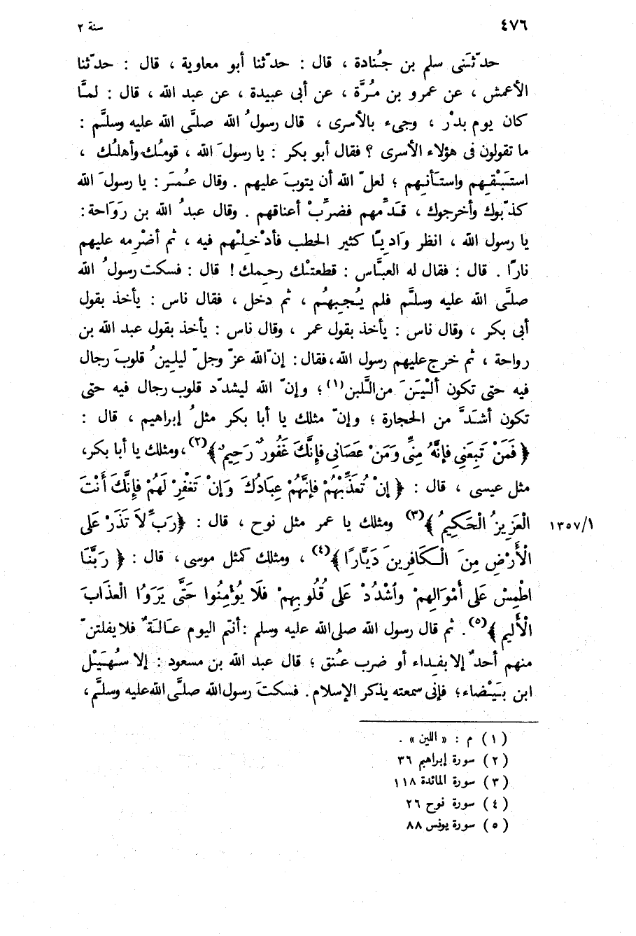 «فَمَنْ تَبِعَنِي فَإِنَّهُ مِنِّي وَمَنْ عَصانِي فَإِنَّكَ غَفُورٌ رَحِيمٌ» ، وَمَثَلَكَ يَا أَبَا بَكْرٍ، مَثَلُ عِيسَى، قَالَ: «إِنْ تُعَذِّبْهُمْ فَإِنَّهُمْ عِبادُكَ وَإِنْ تَغْفِرْ لَهُمْ فَإِنَّكَ أَنْتَ الْعَزِيزُ الْحَكِيمُ» وَمَثَلَكَ يَا عُمَرُ مَثَلُ نُوحٍ، قَالَ: «رَبِّ لا تَذَرْ عَلَى الْأَرْضِ مِنَ الْكافِرِينَ دَيَّاراً» ، وَمَثَلَكَ كَمَثَلِ موسى، قَالَ: «رَبَّنَا اطْمِسْ عَلى أَمْوالِهِمْ وَاشْدُدْ عَلى قُلُوبِهِمْ فَلا يُؤْمِنُوا حَتَّى يَرَوُا الْعَذابَ الْأَلِيمَ» ثم قال رسول الله ص: أَنْتُمُ الْيَوْمَ عَالَةٌ فَلا يَفْلِتَنَّ مِنْهُمْ أَحَدٌ إِلا بِفِدَاءٍ أَوْ ضَرْبِ عُنُقٍ،] قَالَ عَبْدُ الله بن مسعود: الا سهيل ابن بَيْضَاءَ، فَإِنِّي سَمِعْتُه يَذْكُرُ الإِسْلامَ فَسَكَتَ رَسُولُ الله ص،
