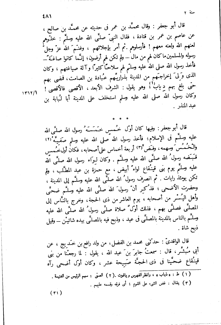 قَالَ أَبُو جَعْفَرٍ: وَفِيهَا كَانَ أَوَّلَ خمس خمسه رسول الله ص في الاسلام، فاخذ رسول الله ص صَفِيَّهُ وَالْخُمُسَ وَسَهْمَهُ، وَفَضَّ أَرْبَعَةَ أَخْمَاسٍ عَلَى أَصْحَابِهِ، فَكَانَ أَوَّلَ خُمُسٍ قَبَضَهُ رَسُولُ اللَّهِ ص وكان لواء رسول الله ص يوم بنى قينقاع لِوَاءً أَبْيَضَ، مَعَ حَمْزَةَ بْنِ عَبْدِ الْمُطَّلِبِ، وَلَمْ تَكُنْ يَوْمَئِذٍ رَايَاتٌ ثُمَّ انْصَرَفَ رَسُولُ الله ص إِلَى الْمَدِينَةِ، وَحَضَرَتِ الأَضْحَى، فَذَكَرَ أَنَّ رَسُولَ الله ص ضَحَّى وَأَهْلُ الْيُسْرِ مِنْ أَصْحَابِهِ، يَوْمَ الْعَاشِرِ مِنْ ذِي الْحِجَّةِ، وَخَرَجَ بِالنَّاسِ إِلَى الْمُصَلَّى فَصَلَّى بِهِمْ، فَذَلِكَ أَوَّلُ صَلَاةٍ صَلَّى رَسُولُ الله ص بِالنَّاسِ بِالْمَدِينَةِ بِالْمُصَلَّى فِي عِيدٍ، وَذَبَحَ فِيهِ بِالْمُصَلَّى بِيَدِهِ شَاتَيْنِ- وَقِيلَ ذَبَحَ شَاةً.