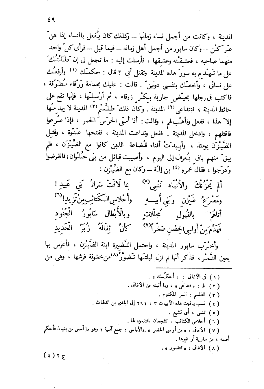 المدينة، وكانت من أجمل نساء زمانها- وكذلك كان يفعل بالنساء إذا هن عركن- وكان سابور من أجمل أهل زمانه- فيما قيل- فرأى كل واحد منهما صاحبه، فعشقته وعشقها، فأرسلت إليه: ما تجعل لي إن دللتك على ما تهدم به سور هذه المدينة وتقتل أبي؟ قَالَ: حكمك وأرفعك على نسائي، وأخصك بنفسي دونهن قالت: عليك بحمامة ورقاء مطوقة، فاكتب في رجلها بحيض جارية بكر زرقاء، ثم أرسلها، فإنها تقع على حائط المدينة، فتتداعى المدينة وكان ذلك طلسم المدينة لا يهدمها إلا هذا، ففعل وتأهب لهم، وقالت: أنا أسقي الحرس الخمر، فإذا صرعوا فاقتلهم، وادخل المدينة ففعل وتداعت المدينة، ففتحها عنوة، وقتل الضيزن يومئذ، وأبيدت أفناء قضاعة الذين كانوا مع الضيزن، فلم يبق منهم باق يعرف إلى اليوم، وأصيبت قبائل من بني حلوان، فانقرضوا ودرجوا، فقال عمرو بن إلة- وكان مع الضيزن: