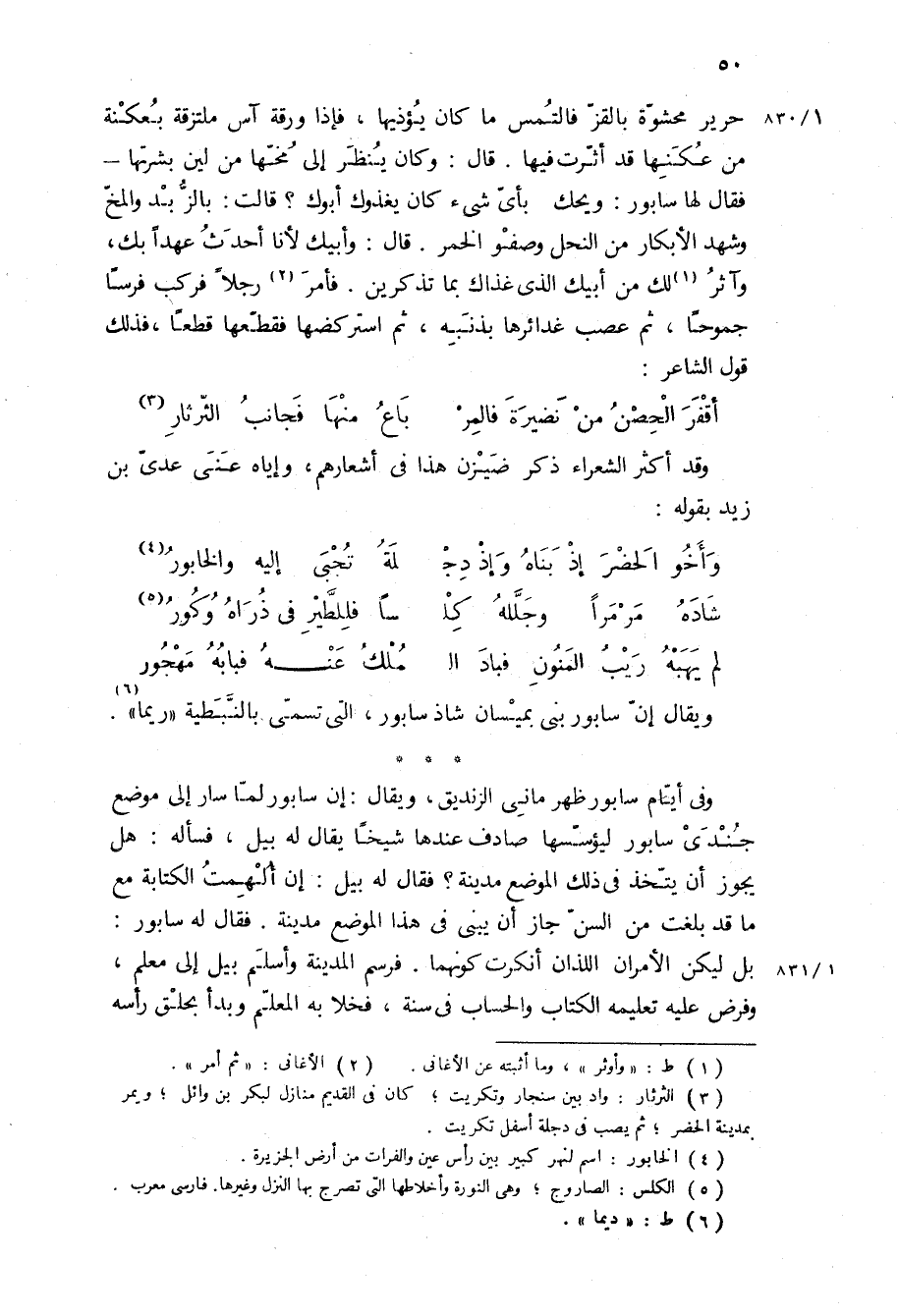 حرير محشوة بالقز فالتمس ما كان يؤذيها، فإذا ورقة آس ملتزقة بعكنة من عكنها قد أثرت فيها قَالَ: وكان ينظر إلى مخها من لين بشرتها- فقال لها سابور: ويحك بأي شيء كان يغذوك أبوك؟ قالت: بالزبد والمخ وشهد الأبكار من النحل وصفو الخمر قَالَ: وأبيك لأنا أحدث عهدا بك، وآثر لك من أبيك الذي غذاك بما تذكرين فأمر رجلا فركب فرسا جموحا، ثم عصب غدائرها بذنبه، ثم استركضها فقطعها قطعا، فذلك قول الشاعر:
