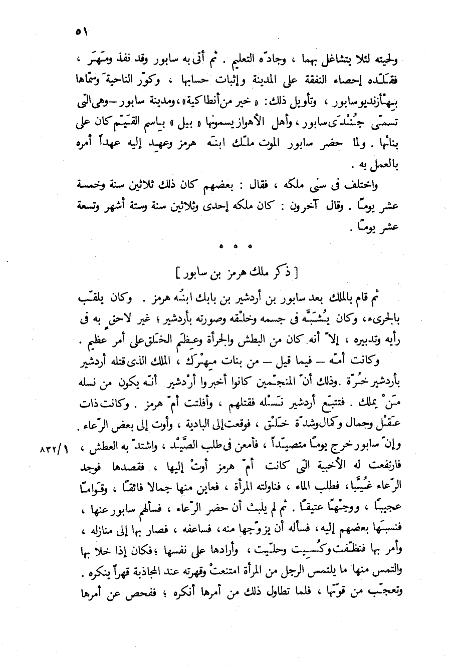 ولحيته لئلا يتشاغل بهما، وجاده التعليم ثم أتى به سابور وقد نفذ ومهر، فقلده إحصاء النفقة على المدينة وإثبات حسابها، وكور الناحية وسماها بهأزنديو سابور، وتأويل ذلك: خير من أنطاكية، ومدينة سابور- وهي التي تسمى جندي سابور، وأهل الأهواز يسمونها بيل باسم القيم كان على بنائها ولما حضر سابور الموت ملك ابنه هرمز وعهد إليه عهدا أمره بالعمل به.