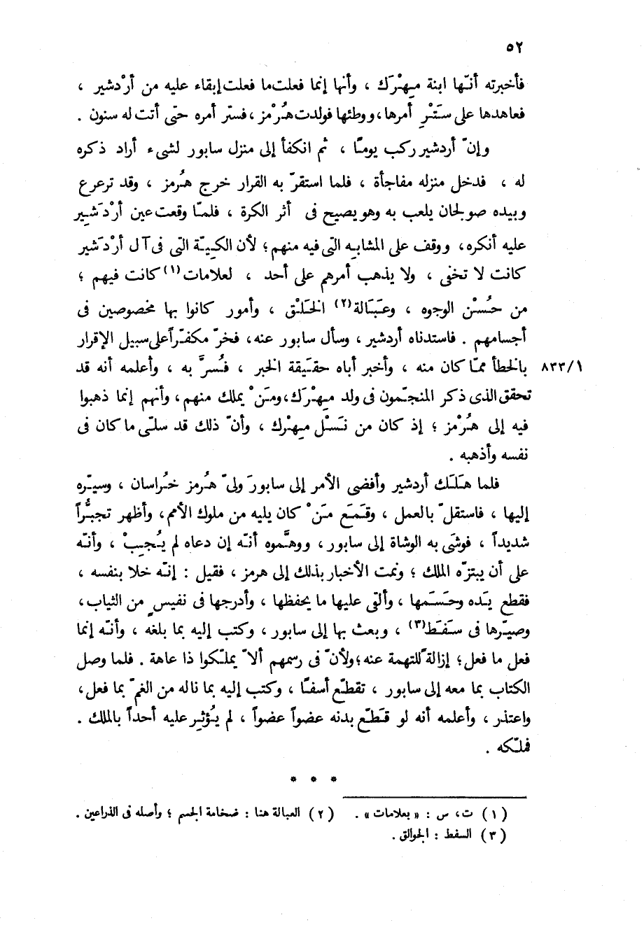 وإن أردشير ركب يوما، ثم انكفأ إلى منزل سابور لشيء أراد ذكره له، فدخل منزله مفاجأة، فلما استقر به القرار خرج هرمز، وقد ترعرع وبيده صولجان يلعب به وهو يصيح في اثر الكرة، فلما وقعت عين أردشير عليه أنكره، ووقف على المشابه التي فيه منهم، لأن الكية التي في آل أردشير كانت لا تخفى، ولا يذهب أمرهم على أحد، لعلامات كانت فيهم، من حسن الوجوه، وعبالة الخلق، وأمور كانوا بها مخصوصين في أجسامهم فاستدناه أردشير، وسأل سابور عنه، فخر مكفرا على سبيل الإقرار بالخطأ مما كان منه، وأخبر أباه حقيقة الخبر، فسر به، وأعلمه أنه قد تحقق الذي ذكر المنجمون في ولد مهرك، ومن يملك منهم، وأنهم إنما ذهبوا فيه إلى هرمز، إذ كان من نسل مهرك، وأن ذلك قد سلى ما كان في نفسه وأذهبه.