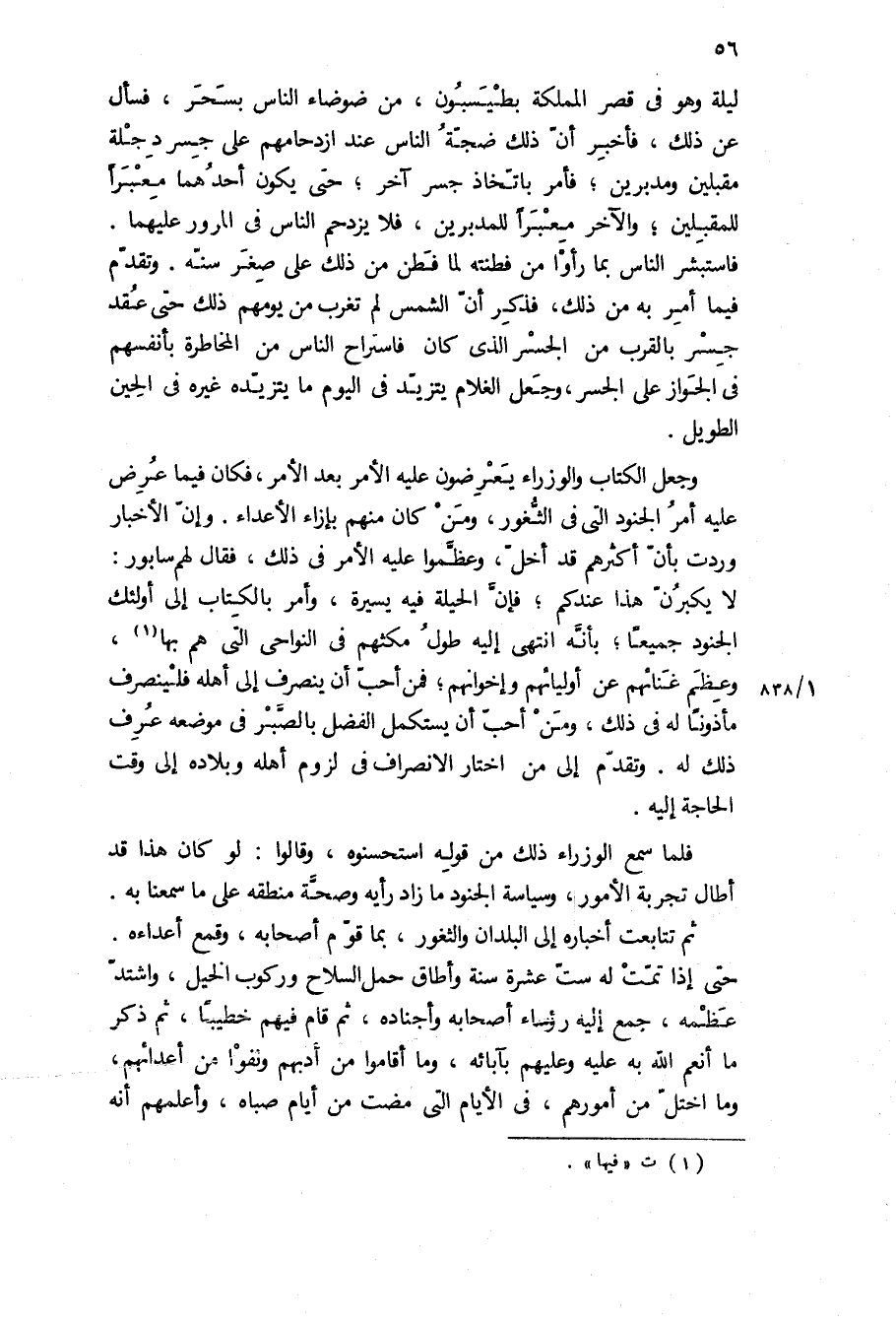 ليلة وهو في قصر المملكة بطيسبون، من ضوضاء الناس بسحر، فسأل عن ذلك، فأخبر أن ذلك ضجة الناس عند ازدحامهم على جسر دجلة مقبلين ومدبرين، فأمر باتخاذ جسر آخر، حتى يكون أحدهما معبرا للمقبلين، والآخر معبرا للمدبرين، فلا يزدحم الناس في المرور عليهما.