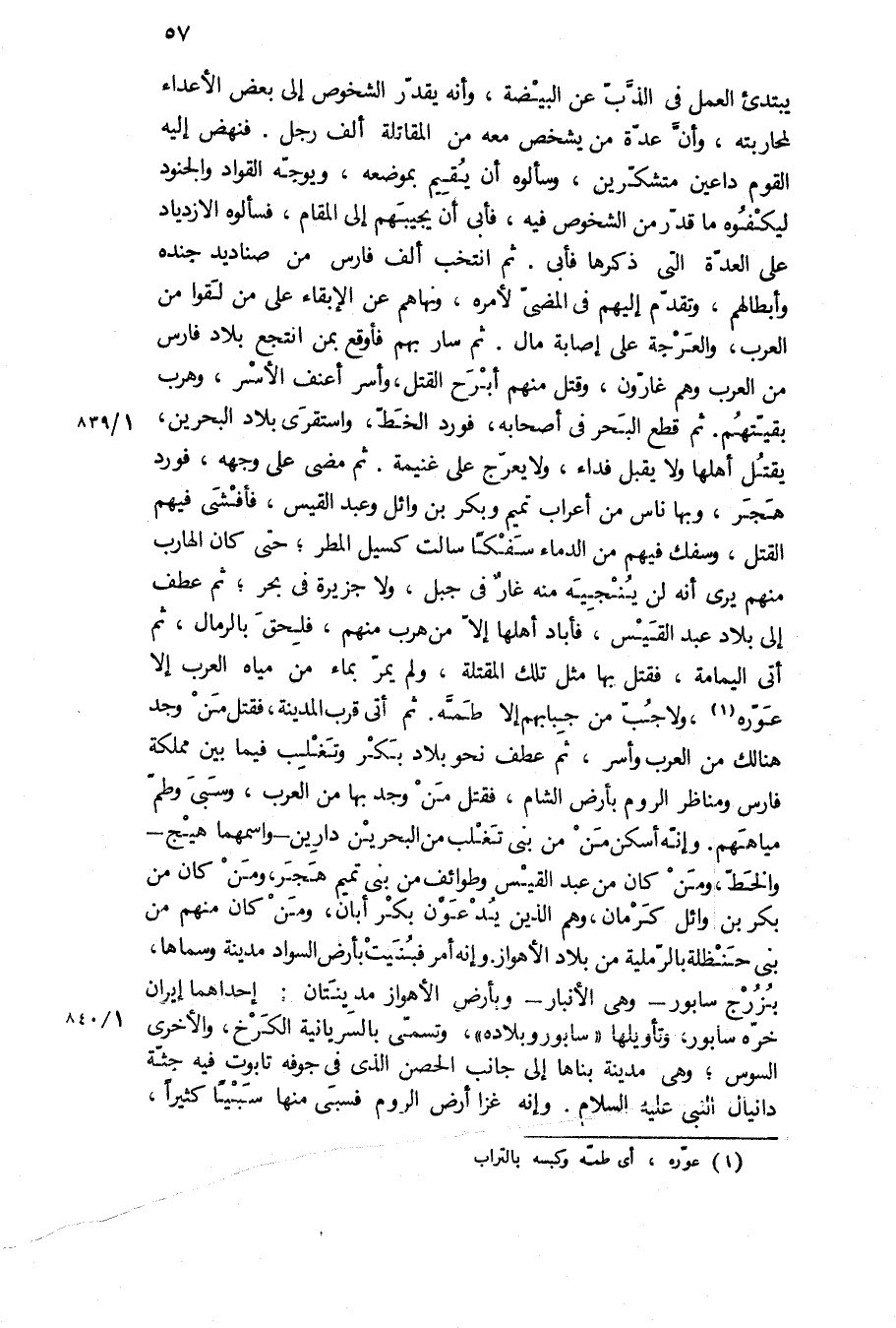 يبتدئ العمل في الذب عن البيضة، وأنه يقدر الشخوص إلى بعض الأعداء لمحاربته، وأن عدة من يشخص معه من المقاتلة ألف رجل فنهض إليه القوم داعين متشكرين، وسألوه أن يقيم بموضعه، ويوجه القواد والجنود ليكفوه ما قدر من الشخوص فيه، فأبى أن يجيبهم إلى المقام، فسألوه الازدياد على العدة التي ذكرها فأبى ثم انتخب ألف فارس من صناديد جنده وأبطالهم، وتقدم إليهم في المضي لأمره، ونهاهم عن الإبقاء على من لقوا من العرب، والعرجة على إصابة مال ثم سار بهم فأوقع بمن انتجع بلاد فارس من العرب وهم غارون، وقتل منهم أبرح القتل، وأسر أعنف الأسر، وهرب بقيتهم ثم قطع البحر في أصحابة، فورد الخط، واستقرى بلاد البحرين، يقتل أهلها ولا يقبل فداء، ولا يعرج على غنيمة ثم مضى على وجهه، فورد هجر، وبها ناس من اعراب تميم وبكر بن وائل وعبد القيس، فأفشي فيهم القتل، وسفك فيهم من الدماء سفكا سالت كسيل المطر، حتى كان الهارب منهم يرى أنه لن ينجيه منه غار في جبل، ولا جزيرة في بحر، ثم عطف إلى بلاد عبد القيس، فأباد أهلها إلا من هرب منهم، فلحق بالرمال، ثم أتى اليمامة، فقتل بها مثل تلك المقتلة، ولم يمر بماء من مياه العرب الا عوره، ولا جب من جبابهم إلا طمه ثم أتي قرب المدينة، فقتل من وجد هنالك من العرب وأسر، ثم عطف نحو بلاد بكر وتغلب فيما بين مملكة فارس ومناظر الروم بأرض الشام، فقتل من وجد بها من العرب، وسبى وطم مياههم وإنه أسكن من من بني تغلب من البحرين دارين- واسمهما هيج- والخط، ومن كان من عبد القيس وطوائف من بني تميم هجر، ومن كان من بكر بن وائل كرمان، وهم الذين يدعون بكر أبان، ومن كان منهم من بني حنظلة بالرملية من بلاد الأهواز وإنه أمر فبنيت بأرض السواد مدينة وسماها، بزرج سابور- وهي الأنبار- وبأرض الأهواز مدينتان: إحداهما ايران خره سابور، وتأويلها سابور وبلاده، وتسمى بالسريانية الكرخ، والأخرى السوس، وهي مدينة بناها إلى جانب الحصن الذي في جوفه تابوت فيه جثة دانيال النبي ع وإنه غزا أرض الروم فسبي منها سبيا كثيرا،