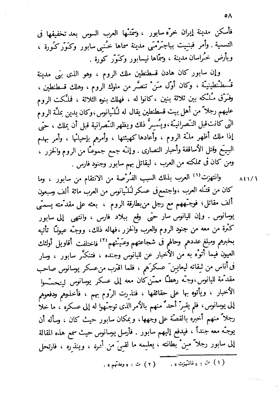 وإن سابور كان هادن قسطنطين ملك الروم، وهو الذي بني مدينة قسطنطينية، وكان أول من تنصر من ملوك الروم، وهلك قسطنطين، وفرق ملكه بين ثلاثة بنين، كانوا له، فهلك بنوه الثلاثة، فملكت الروم عليهم رجلا من أهل بيت قسطنطين يقال له لليانوس، وكان يدين بملة الروم التي كانت قبل النصرانية، ويسر ذلك ويظهر النصرانية قبل أن يملك، حتى إذا ملك أظهر ملة الروم، وأعادها كهيئتها، وأمرهم بإحيائها، وأمر بهدم البيع وقتل الأساقفة وأحبار النصارى وإنه جمع جموعا من الروم والخزر، ومن كان في مملكته من العرب، ليقاتل بهم سابور وجنود فارس.