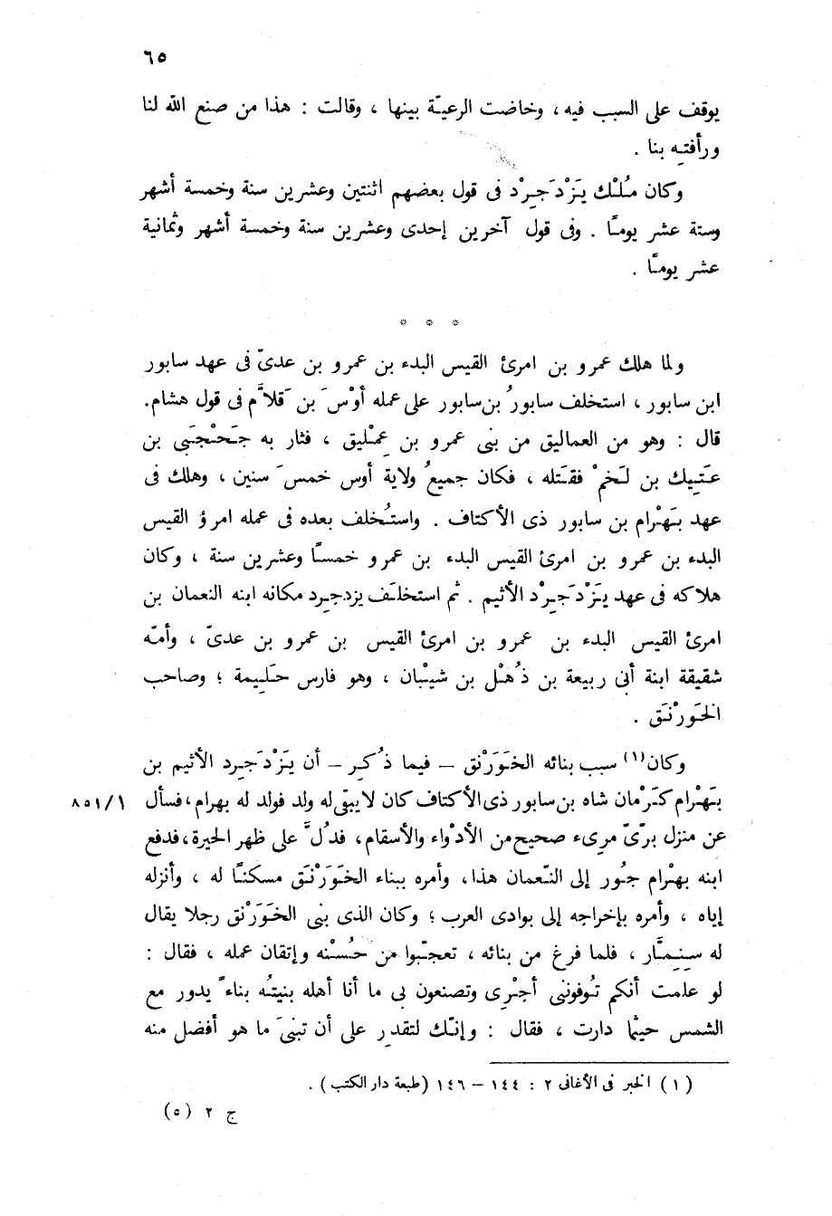 قَالَ: وهو من العماليق من بني عمرو بن عمليق، فثار به جحجبى بن عتيك بن لخم فقتله، فكان جميع ولاية أوس خمس سنين، وهلك في عهد بهرام بن سابور ذي الأكتاف واستخلف بعده في عمله امرؤ القيس البدء بن عمرو بن امرئ القيس البدء بن عمرو خمسا وعشرين سنة، وكان هلاكه في عهد يزدجرد الاثيم ثم استخلف يزدجرد مكانه ابنه النعمان بن امرئ القيس البدء بن عمرو بن امرئ القيس بن عمرو بن عدي، وأمه شقيقة ابنة أبي ربيعة بن ذهل بن شيبان، وهو فارس حليمة، وصاحب الخورنق.