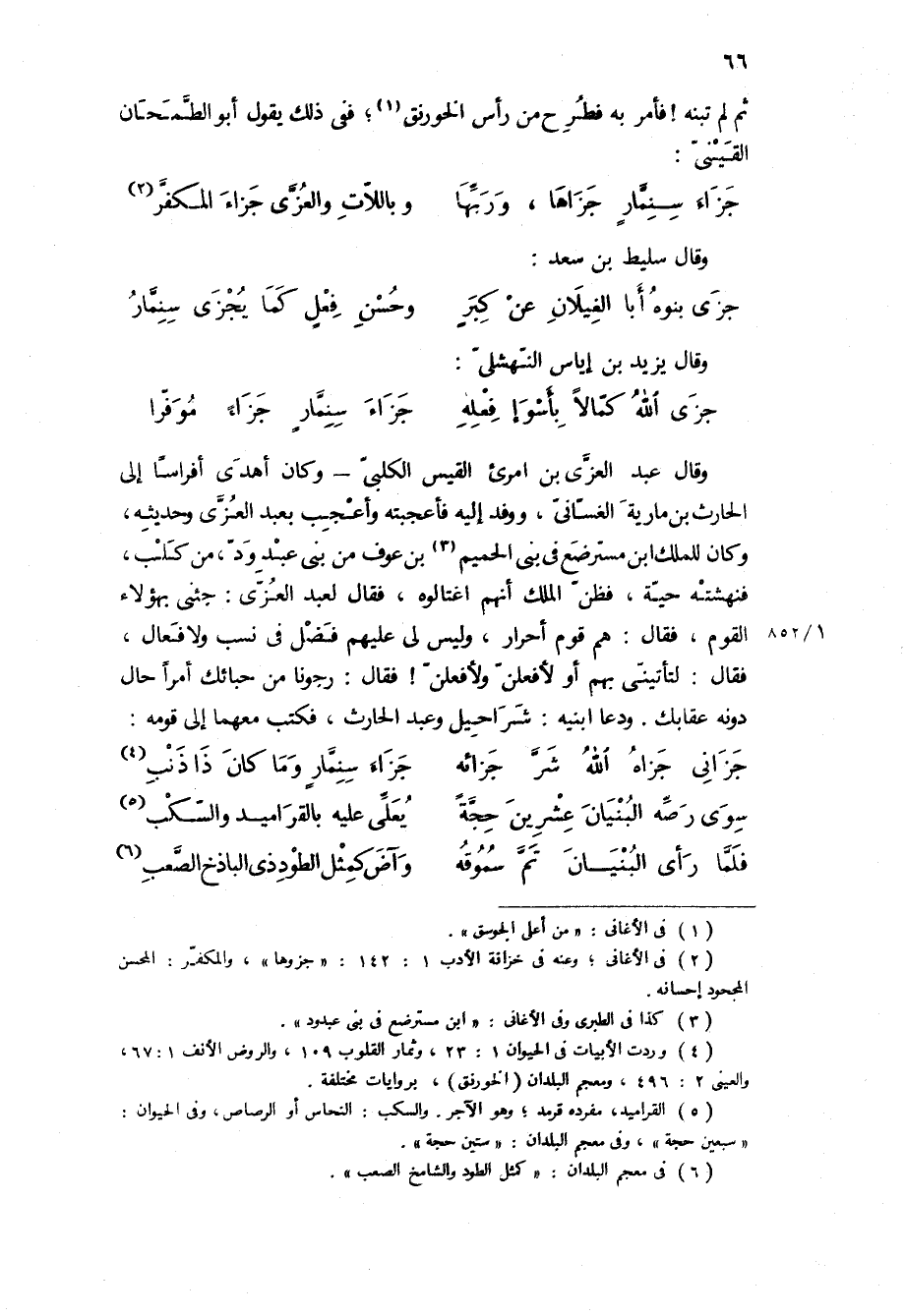 وقال عبد العزى بن امرئ القيس الكلبي- وكان أهدى أفراسا إلى الحارث بن مارية الغساني، ووفد إليه فأعجبته وأعجب بعبد العزى وحديثه، وكان للملك ابن مسترضع في بني الحميم بن عوف من بنى عبد ود، من كلب، فنهشته حية، فظن الملك إنهم اغتالوه، فقال لعبد العزى: جئني بهؤلاء القوم، فقال: هم قوم أحرار، وليس لي عليهم فضل في نسب ولا فعال، فقال: لتأتيني بهم أو لأفعلن ولأفعلن! فقال: رجونا من حبائك أمرا حال دونه عقابك ودعا ابنيه: شراحيل وعبد الحارث، فكتب معهما إلى قومه: