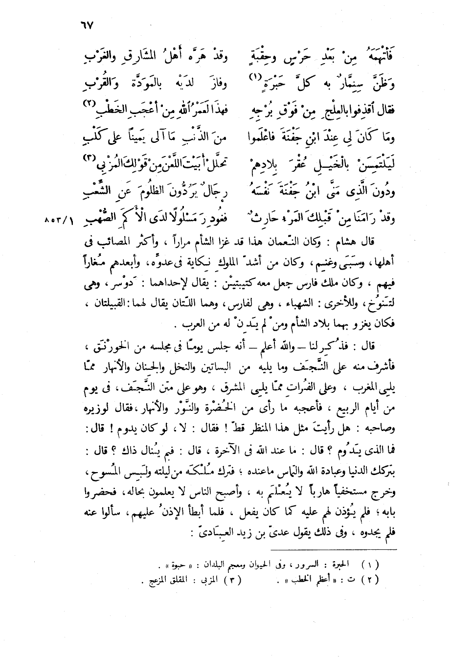 قَالَ هشام: وكان النعمان هذا قد غزا الشام مرارا، وأكثر المصائب في أهلها، وسبى وغنم، وكان من أشد الملوك نكاية في عدوه، وأبعدهم مغارا فيهم، وكان ملك فارس جعل معه كتيبتين: يقال لأحداهما: دوسر، وهي لتنوخ، وللأخرى: الشهباء، وهي لفارس، وهما اللتان يقال لهما: القبيلتان، فكان يغزو بهما بلاد الشام ومن لم يدن له من العرب.
