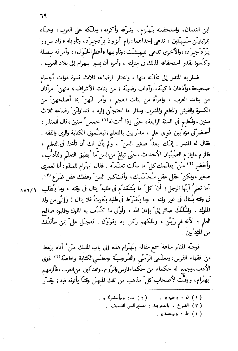 ابن النعمان، واستحضنه بهرام، وشرفه وأكرمه، وملكه على العرب، وحباه بمرتبتين سنيتين، تدعى إحداهما: رام ابزوذ يزدجرد، وتأويله زاد سرور يزدجرد، والأخرى تدعى بمهشت، وتأويلها أعظم الخول، وأمر له بصلة وكسوة بقدر استحقاقه لذلك في منزلته، وأمره أن يسير ببهرام إلى بلاد العرب.