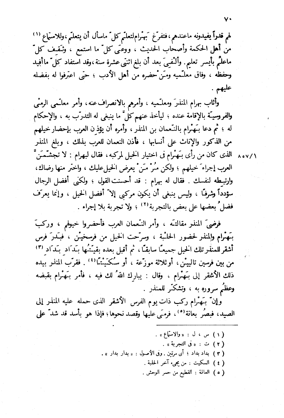 وإن بهرام ركب ذات يوم الفرس الأشقر الذي حمله عليه المنذر إلى الصيد، فبصر بعانة، فرمى عليها وقصد نحوها، فإذا هو بأسد قد شد على