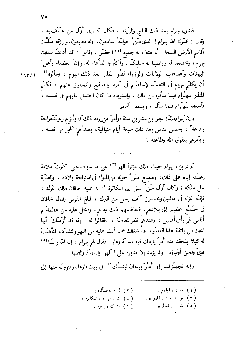 فتناول بهرام بعد ذلك التاج والزينة، فكان كسرى أول من هتف به، وقال: عمرك الله بهرام! الذى من حوله سامعون، وله مطيعون، ورزقه ملك أقاليم الأرض السبعة ثم هتف به جميع الحضر، وقالوا: قد أذعنا للملك بهرام، وخضعنا له ورضينا به ملكا وأكثروا الدعاء له وإن العظماء وأهل البيوتات وأصحاب الولايات والوزراء لقوا المنذر بعد ذلك اليوم، وسألوه أن يكلم بهرام في التغمد لإساءتهم في أمره، والصفح والتجاوز عنهم، فكلم المنذر بهرام فيما سألوه من ذلك، واستوهبه ما كان احتمل عليهم في نفسه، فأسعفه بهرام فيما سأل، وبسط آمالهم.