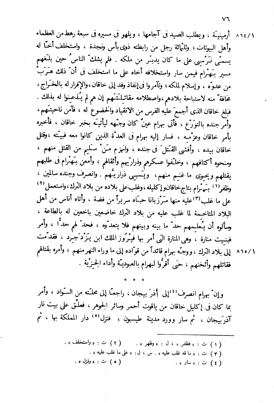 فبلغ خاقان الذي أجمع عليه الفرس من الانقياد والخضوع له، فآمن ناحيتهم، وأمر جنده بالتورع، فأتى بهرام عين كان وجهه ليأتيه بخبر خاقان، فأخبره بأمر خاقان وعزمه، فسار إليه بهرام في العدة الذين كانوا معه فبيته، وقتل خاقان بيده، وأفشى القتل في جنده، وانهزم من سلم من القتل منهم، ومنحوه أكتافهم، وخلفوا عسكرهم وذراريهم وأثقالهم، وأمعن بهرام في طلبهم يقتلهم ويحوي ما غنم منهم، ويسبي ذراريهم وانصرف وجنده سالمين، وظفر بهرام بتاج خاقان وإكليله، وغلب على بلاده من بلاد الترك، واستعمل على ما غلب عليه منها مرزبانا حباه سريرا من فضة، وأتاه أناس من أهل البلاد المتاخمة لما غلب عليه من بلاد الترك خاضعين باخعين له بالطاعة، وسألوه أن يعلمهم حد ما بينه وبينهم فلا يتعدوه، فحد لهم حدا، وأمر فبنيت منارة، وهي المنارة التي أمر بها فيروز الملك ابن يزدجرد، فقدمت إلى بلاد الترك، ووجه بهرام قائدا من قواده إلى ما وراء النهر منهم، وامره بقتالهم فقاتلهم وأثخنهم، حتى أقروا لبهرام بالعبودية وأداء الجزية.