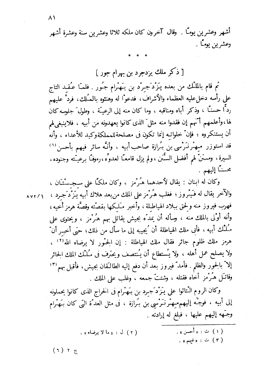ثم قام بالملك من بعده يزدجرد بن بهرام جور فلما عقد التاج على رأسه دخل عليه العظماء والأشراف، فدعوا له وهنئوه بالملك، فرد عليهم ردا حسنا، وذكر أباه ومناقبه، وما كان منه إلى الرعية، وطول جلوسه كان لها، وأعلمهم أنهم إن فقدوا منه مثل الذي كانوا يعهدونه من أبيه، فلا ينبغي لهم أن يستنكروه، فإن خلواته انما تكون في مصلحه للمملكه وكيد للأعداء، وأنه قد استوزر مهر نرسي بن برازة صاحب أبيه، وإنه سائر فيهم بأحسن السيرة، ومستن لهم أفضل السنن، ولم يزل قامعا لعدوه، رءوفا برعيته وجنوده، محسنا إليهم.