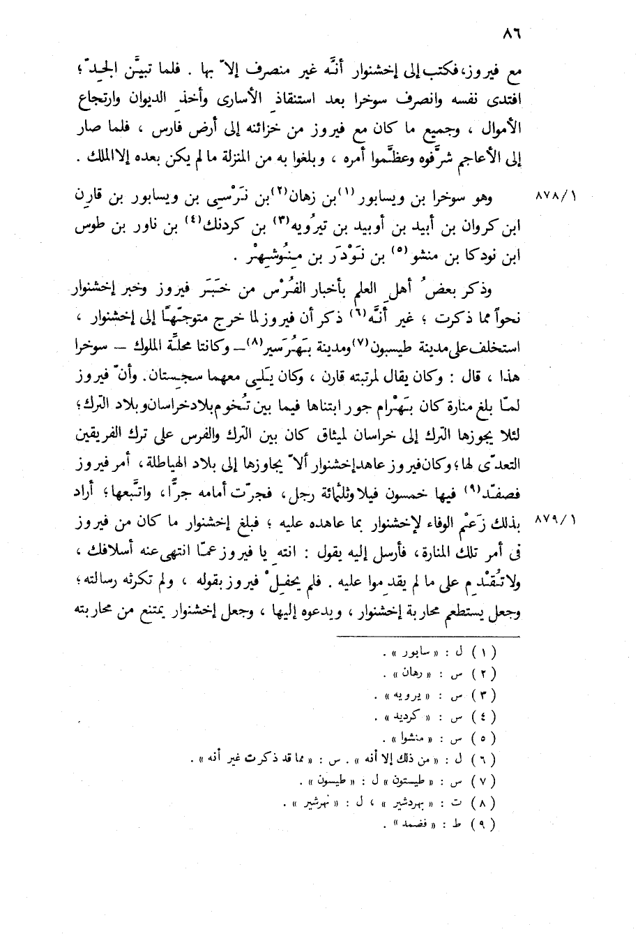وذكر بعض أهل العلم بأخبار الفرس من خبر فيروز وخبر اخشنوار نحوا مما ذكرت، غير أنه ذكر أن فيروز لما خرج متوجها إلى اخشنوار، استخلف على مدينة طيسبون ومدينة بهرسير- وكانتا محلة الملوك- سوخرا هذا، قَالَ: وكان يقال لمرتبته قارن، وكان يلي معهما سجستان وأن فيروز لما بلغ منارة كان بهرام جور ابتناها فيما بين تخوم بلاد خراسان وبلاد الترك، لئلا يجوزها الترك إلى خراسان لميثاق كان بين الترك والفرس على ترك الفريقين التعدى لها، وكان فيروز عاهد اخشنوار الا يجاوزها الى بلاد الهياطلة، امر فيروز فصفد فيها خمسون فيلا وثلاثمائة رجل، فجرت أمامه جرا، واتبعها، أراد بذلك زعم الوفاء لاخشنوار بما عاهده عليه، فبلغ اخشنوار ما كان من فيروز في أمر تلك المنارة، فأرسل إليه يقول: انته يا فيروز عما انتهى عنه أسلافك، ولا تقدم على ما لم يقدموا عليه فلم يحفل فيروز بقوله، ولم تكرثه رسالته، وجعل يستطعم محاربة اخشنوار، ويدعوه إليها، وجعل اخشنوار يمتنع من محاربته