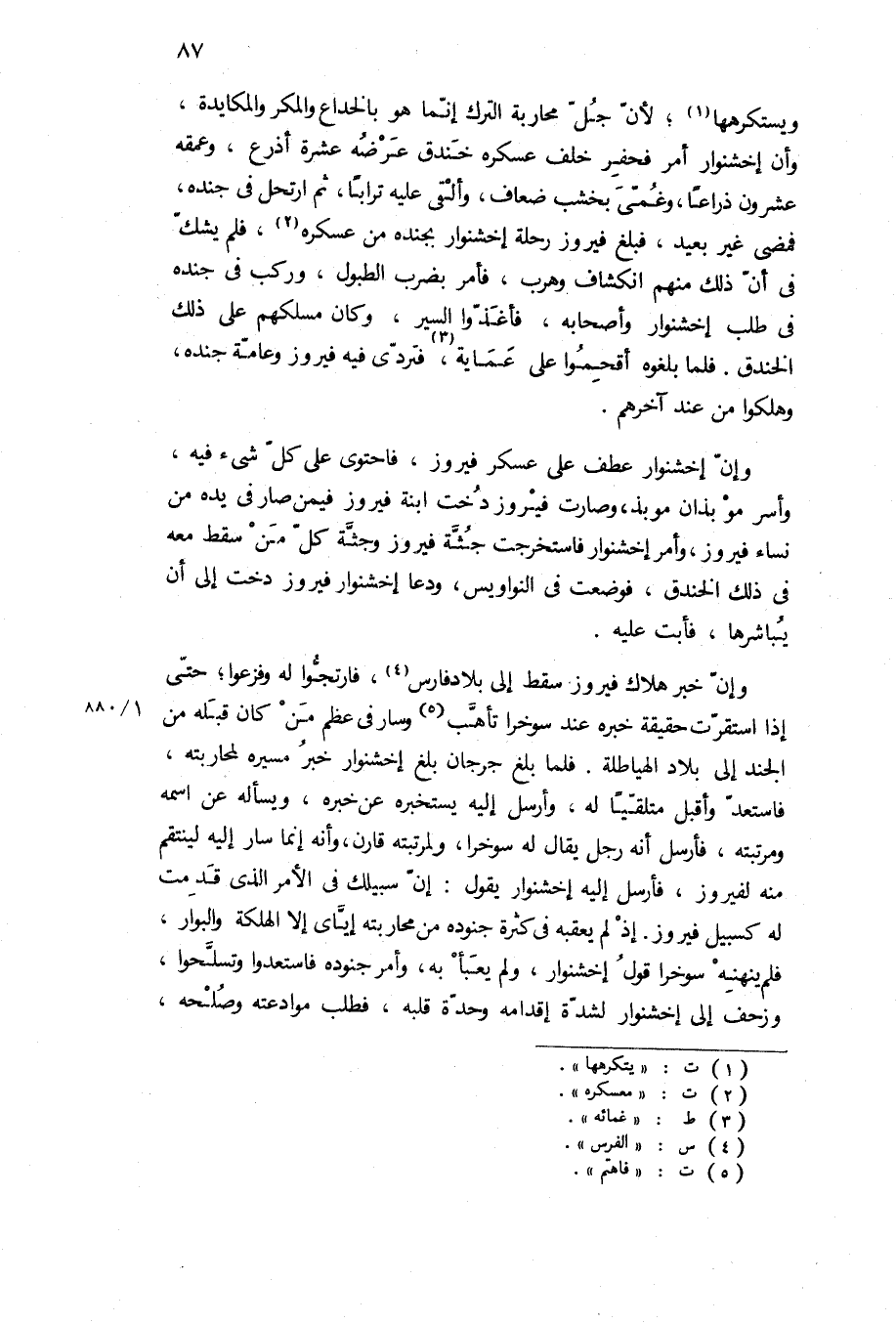ويستكرهها، لأن جل محاربة الترك إنما هو بالخداع والمكر والمكايدة، وإن اخشنوار أمر فحفر خلف عسكره خندق عرضه عشرة أذرع، وعمقه عشرون ذراعا، وغمى بخشب ضعاف، وألقى عليه ترابا، ثم ارتحل في جنده، فمضى غير بعيد، فبلغ فيروز رحلة اخشنوار بجنده من عسكره، فلم يشك في أن ذلك منهم انكشاف وهرب، فأمر بضرب الطبول، وركب في جنده في طلب اخشنوار وأصحابه، فأغذوا السير، وكان مسلكهم على ذلك الخندق فلما بلغوه اقحموا على عماية، فتردى فيه فيروز وعامة جنده، وهلكوا من عند آخرهم.