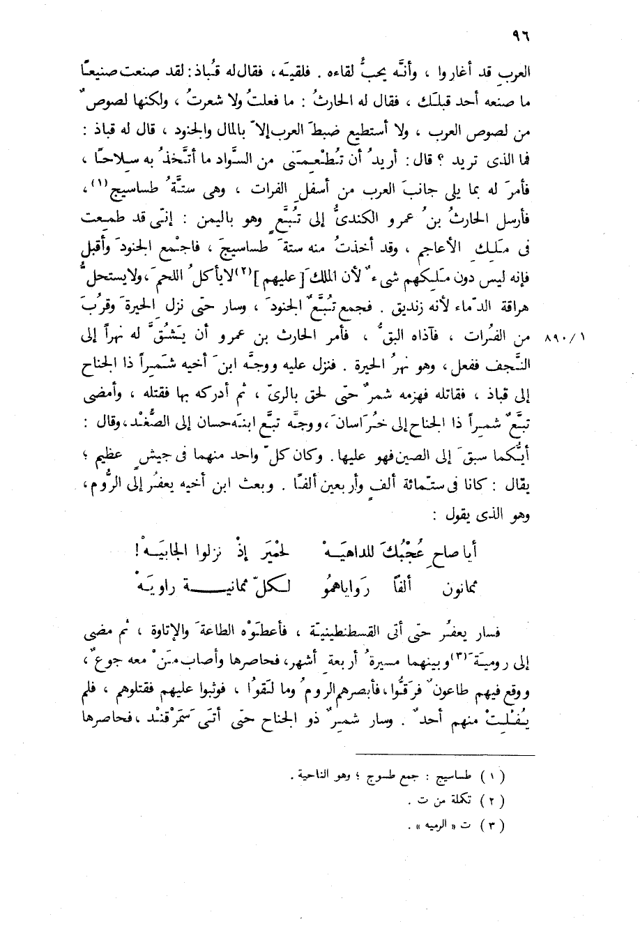 العرب قد أغاروا، وأنه يحب لقاءه فلقيه، فقال له قباذ: لقد صنعت صنيعا ما صنعه أحد قبلك، فقال له الحارث: ما فعلت ولا شعرت، ولكنها لصوص من لصوص العرب، ولا أستطيع ضبط العرب إلا بالمال والجنود، قَالَ له قباذ: