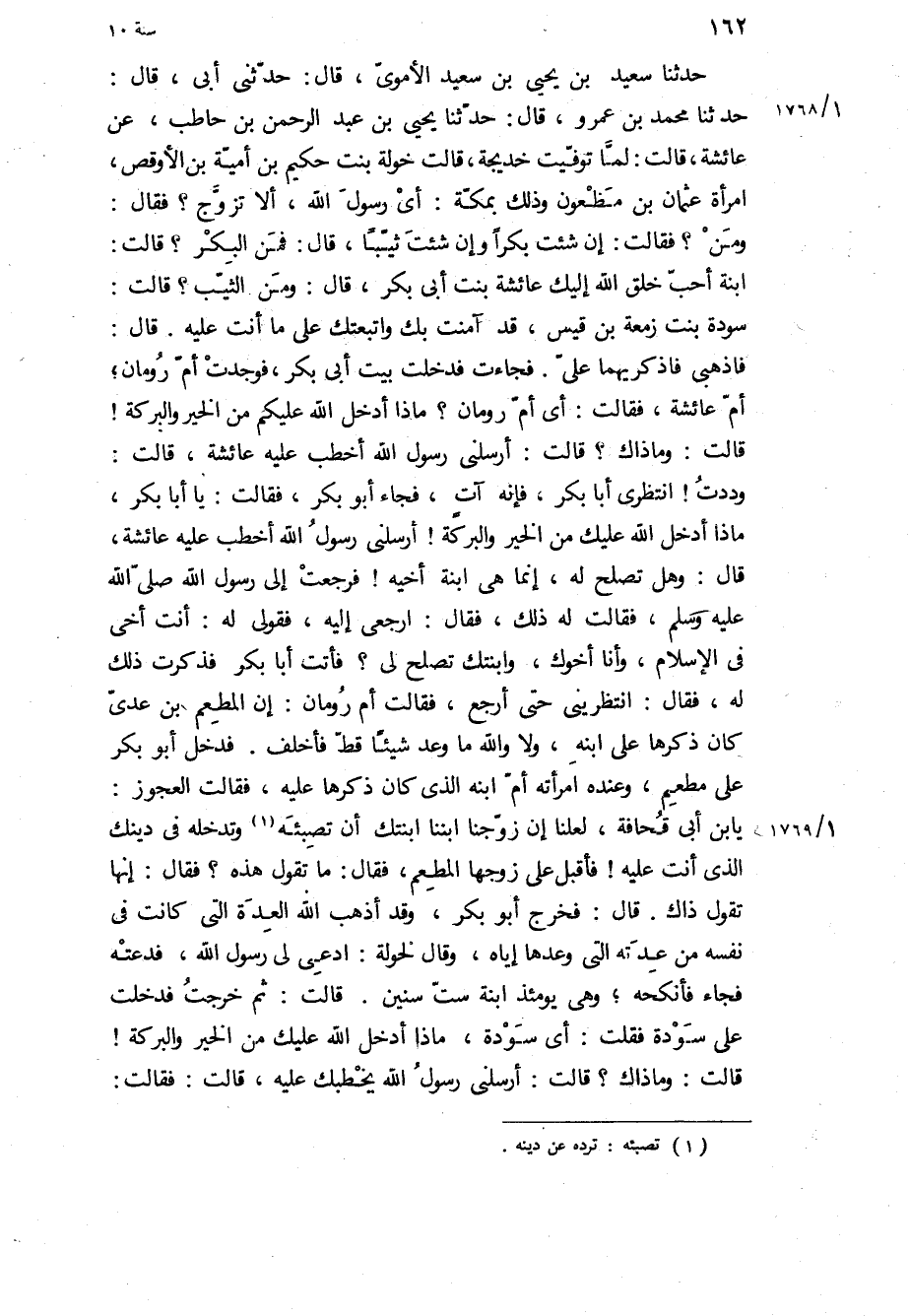 يا بن أَبِي قُحَافَةَ، لَعَلَّنَا إِنْ زَوَّجْنَا ابْنَنَا ابْنَتَكَ أَنْ تَصْبِئَهُ وَتُدْخِلَهُ فِي دِينِكَ الَّذِي أَنْتَ عَلَيْهِ! فَأْقَبَلَ عَلَى زَوْجِهَا الْمُطْعِمِ، فَقَالَ: مَا تَقُولُ هَذِهِ؟ فَقَالَ: إِنَّهَا تَقُولُ ذَاكَ قَالَ: فَخَرَجَ أَبُو بَكْرٍ، وَقَدْ أَذْهَبَ اللَّهُ الْعِدَةَ الَّتِي كَانَتْ فِي نَفْسِهِ مِنْ عِدَتِهِ الَّتِي وَعَدَهَا إِيَّاهُ، وَقَالَ لِخَوْلَةَ: ادْعِي لِي رَسُولَ اللَّهِ، فَدَعَتْهُ فَجَاءَ فَأَنْكَحَهُ، وَهِيَ يَوْمَئِذٍ ابْنَةُ سِتِّ سِنِينَ قَالَتْ: ثُمَّ خَرَجْتُ فَدَخَلْتُ عَلَى سَوْدَةَ فَقُلْتُ: أَيْ سَوْدَةُ، مَاذَا أَدْخَلَ اللَّهُ عَلَيْكِ مِنَ الْخَيْرِ وَالْبَرَكَةِ! قَالَتْ: وَمَا ذَاكَ؟ قالت: أرسلني رسول الله يخطبك عَلَيْهِ، قَالَتْ: فَقَالَتْ: