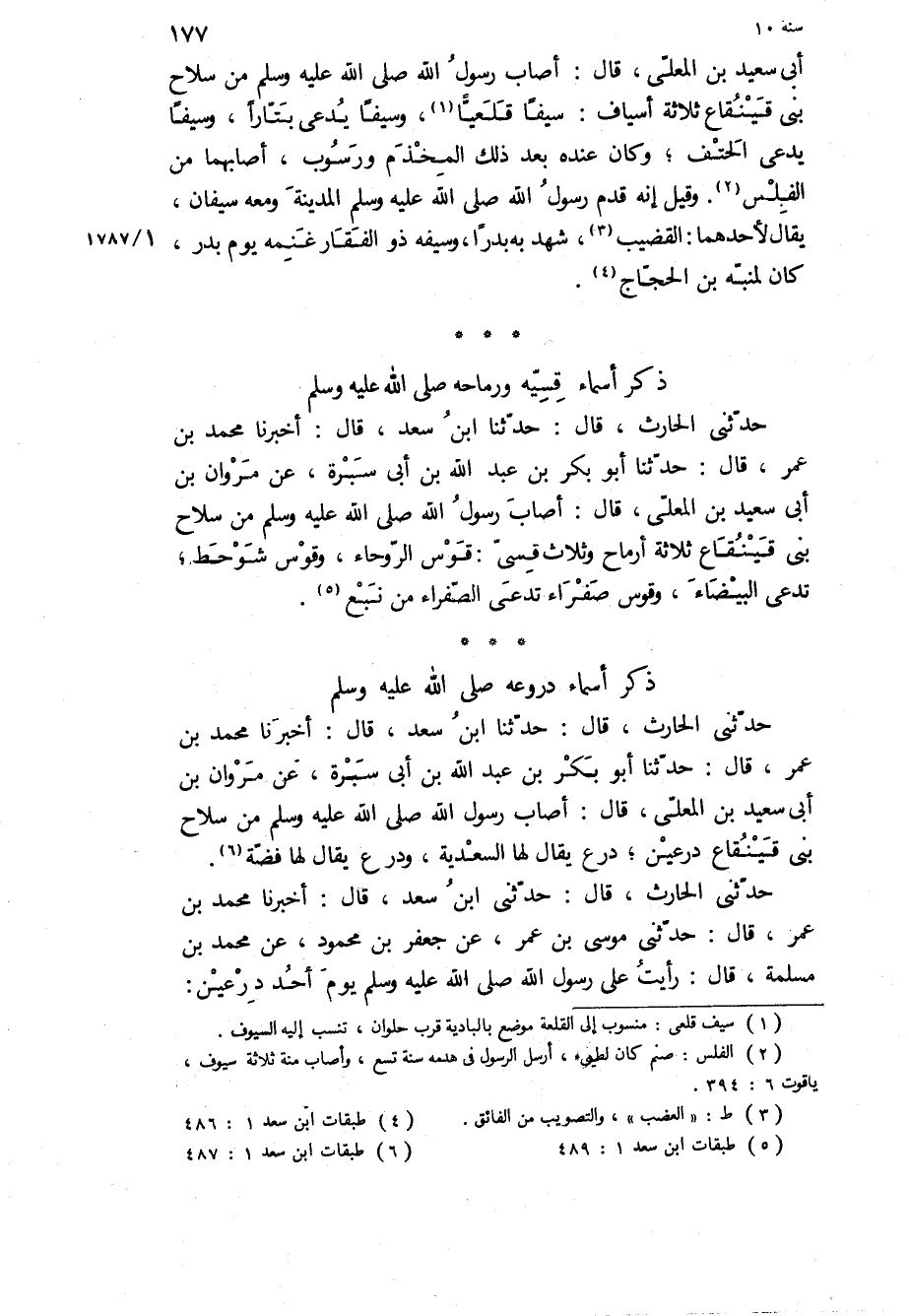 أَبِي سَعِيدِ بْنِ الْمُعَلَّى، قَالَ: أَصَابَ رَسُولُ الله ص مِنْ سِلاحِ بَنِي قَيْنُقَاعَ ثَلاثَةَ أَسْيَافٍ: سَيْفًا قَلَعِيًّا، وَسَيْفًا يُدْعَى بَتَّارًا، وَسَيْفًا يُدْعَى الْحَتْفَ، وَكَانَ عِنْدَهُ بَعْدَ ذَلِكَ الْمُخَذِّمُ وَرَسُوبٌ، أَصَابَهُمَا من الفلس وقيل انه قدم رسول الله ص المدينة ومعه سيفان، يقال لأحدهما: القضيب، شَهِدَ بِهِ بَدْرًا، وَسَيْفُهُ ذُو الْفَقَارِ غَنِمَهُ يَوْمَ بَدْرٍ، كَانَ لِمُنَبِّهِ بْنِ الْحَجَّاجِ