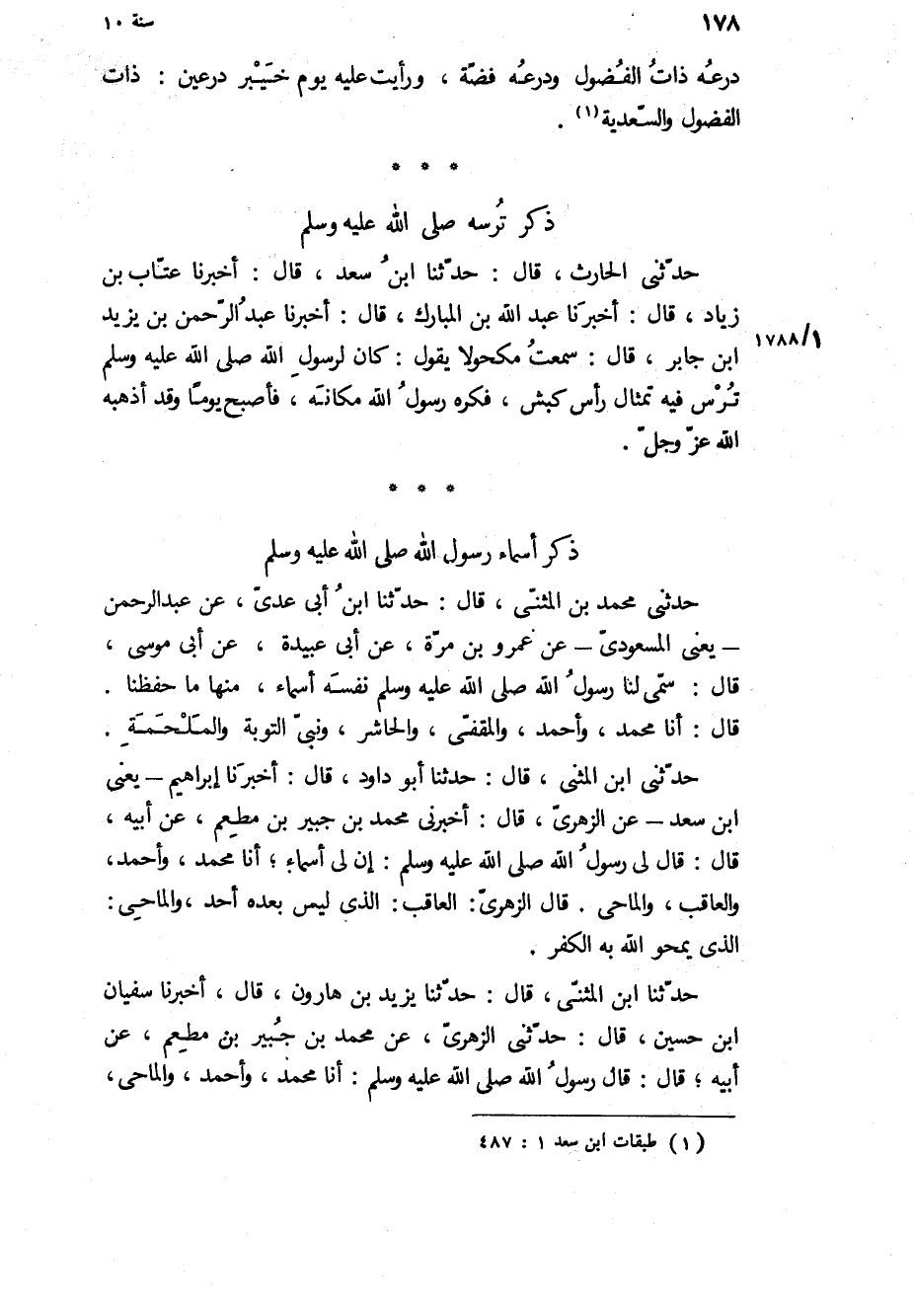 حَدَّثَنِي ابْنُ الْمُثَنَّى، قَالَ: حَدَّثَنَا أَبُو دَاوُدَ، قَالَ: أَخْبَرَنَا إِبْرَاهِيمُ- يَعْنِي ابْنَ سَعْدٍ- عَنِ الزُّهْرِيِّ، قَالَ: أَخْبَرَنِي مُحَمَّدِ بْنِ جُبَيْرِ بْنِ مُطْعِمٍ، عَنْ أَبِيهِ، [قَالَ: قَالَ لِي رَسُولُ الله ص: إِنَّ لِي أَسْمَاءً، أَنَا مُحَمَّدٌ، وَأَحْمَدُ، وَالْعَاقِبُ، والماحى] قال الزهري: العاقب: الَّذِي لَيْسَ بَعْدَهُ أَحَدٌ، وَالْمَاحِي: