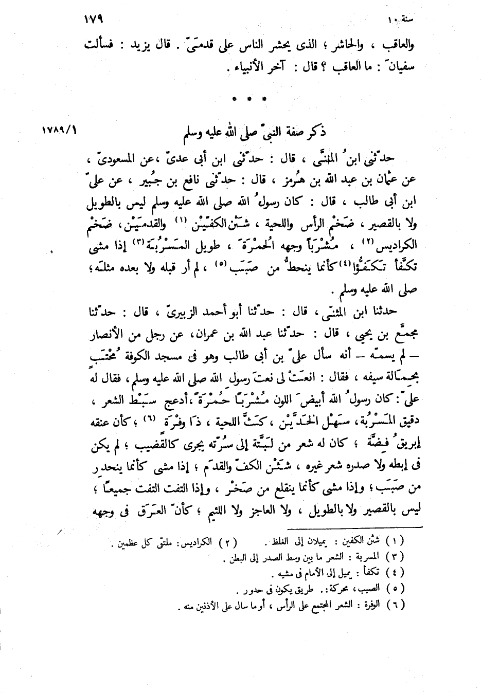 حدثنى ابن المثنى، قال: حدثنى ابْنُ أَبِي عَدِيٍّ، عَنِ الْمَسْعُودِيِّ، عَنْ عُثْمَانَ بْنِ عَبْدِ اللَّهِ بْنِ هُرْمُزَ، قَالَ: حَدَّثَنِي نافع بن جبير، [عن على ابن ابى طالب، قال: كان رسول الله ص لَيْسَ بِالطَّوِيلِ وَلا بِالْقَصِيرِ، ضَخْمَ الرَّأْسِ وَاللِّحْيَةِ، شَثْنَ الْكَفَّيْنِ وَالْقَدَمَيْنِ، ضَخْمَ الْكَرَادِيسِ، مُشْرَبًا وَجْهُهُ الْحُمْرَةَ، طَوِيلَ الْمَسْرُبَةِ إِذَا مَشَى تَكَفَّأَ تَكَفُّؤًا كَأَنَّمَا يَنْحَطُّ مِنْ صَبَبٍ، لَمْ أَرَ قَبْلَهُ ولا بعده مثله، ص] /.