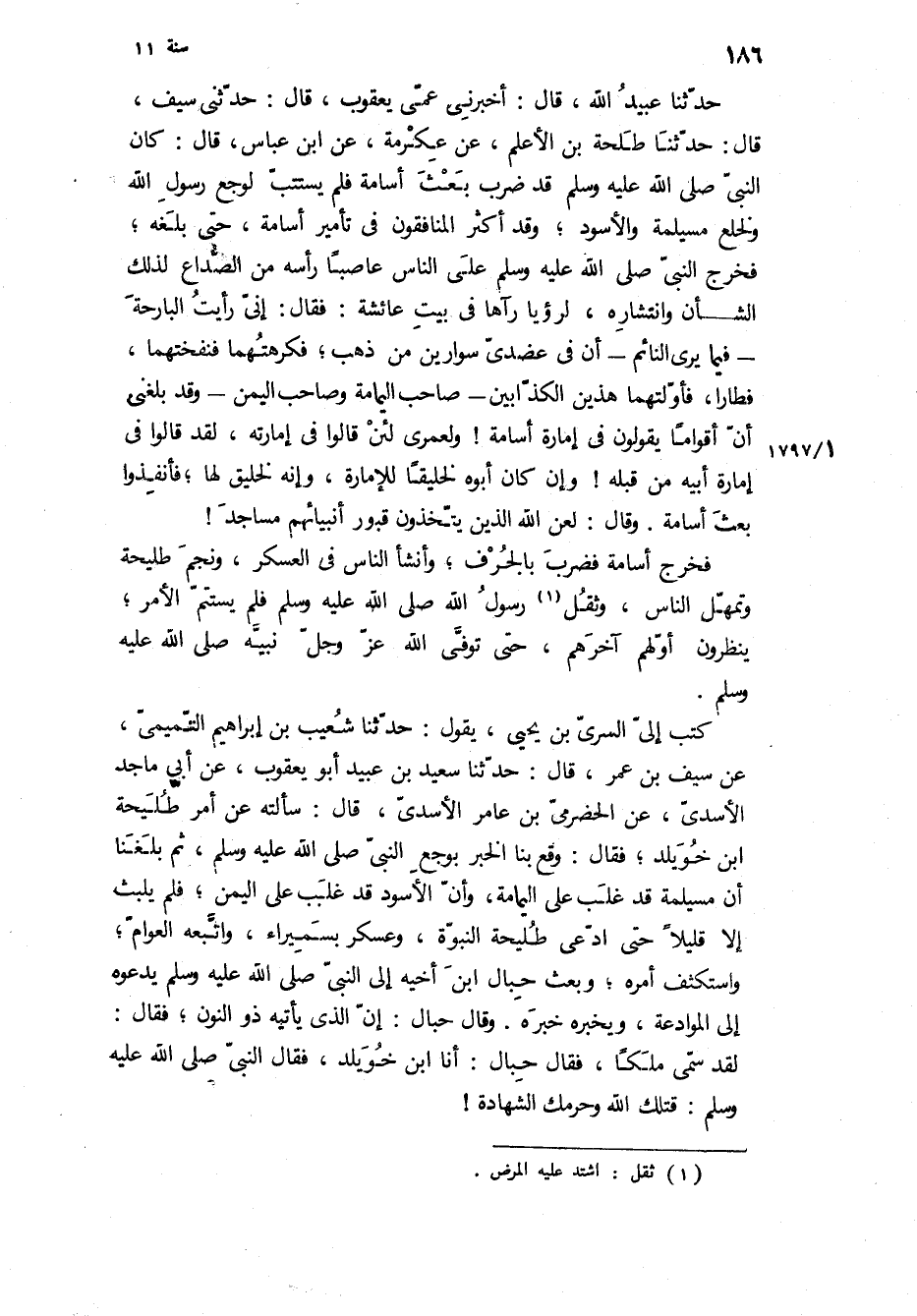 حَدَّثَنَا عُبْيَدُ اللَّهِ، قَالَ: أَخْبَرَنِي عَمِّي يَعْقُوبُ، قَالَ: حَدَّثَنِي سَيْفٌ، قَالَ: حَدَّثَنَا طَلْحَةُ بْنُ الأَعْلَمِ، عَنْ عِكْرِمَةَ، عَنِ ابْنِ عَبَّاسٍ، قَالَ: كَانَ النبي ص قَدْ ضَرَبَ بَعْثَ أُسَامَةَ فَلَمْ يَسْتَتَبَّ لِوَجَعِ رَسُولِ اللَّهِ وَلِخَلْعِ مُسَيْلِمَةَ وَالأَسْوَدِ، وَقَدْ أَكْثَرَ الْمُنَافِقُونَ فِي تَأْمِيرِ أُسَامَةَ، حَتَّى بَلَغَهُ، فَخَرَجَ النبي ص عَلَى النَّاسِ عَاصِبًا رَأْسَهُ مِنَ الصُّدَاعِ لِذَلِكَ الشَّأْنِ وَانْتِشَارِهِ، لِرُؤْيَا رَآهَا فِي بَيْتِ عَائِشَةَ: [فَقَالَ: إِنِّي رَأَيْتُ الْبَارِحَةَ- فِيمَا يَرَى النَّائِمُ- أَنَّ فِي عَضُدِي سِوَارَيْنِ مِنْ ذَهَبٍ، فَكَرِهْتُهُمَا فَنَفَخْتُهُمَا، فَطَارَا، فَأَوَّلْتُهُمَا هَذَيْنِ الْكَذَّابَيْنِ- صَاحِبَ الْيَمَامَةِ وَصَاحِبَ الْيَمَنِ- وَقَدْ بَلَغَنِي أَنَّ أَقْوَامًا يَقُولُونَ فِي إِمَارَةِ أُسَامَةَ! وَلَعَمْرِي لَئِنْ قَالُوا فِي إِمَارَتِهِ، لَقَدْ قَالُوا فِي إِمَارَةِ أَبِيهِ مِنْ قَبْلِهِ! وَإِنْ كَانَ أَبُوهُ لَخَلِيقًا لِلإِمَارَةِ، وَإِنَّهُ لَخَلِيقٌ لَهَا، فَأَنْفِذُوا بَعْثَ أُسَامَةَ وَقَالَ: لَعَنَ اللَّهُ الَّذِينَ يَتَّخِذُونَ قُبُورَ أَنْبِيَائِهِمْ مَسَاجِدَ!] فَخَرَجَ أُسَامَةُ فَضَرَبَ بِالْجُرْفِ، وَأَنْشَأَ النَّاسُ فِي الْعَسْكَرِ، وَنَجَمَ طُلَيْحَةُ وَتَمَهَّلَ النَّاسُ، وَثَقُلَ رَسُولُ اللَّهِ ص فَلَمْ يُسْتَتَمَّ الأَمْرُ، يَنْظُرُونَ أَوَّلُهُمْ آخِرَهُمْ، حَتَّى توفى الله عز وجل نبيه ص.