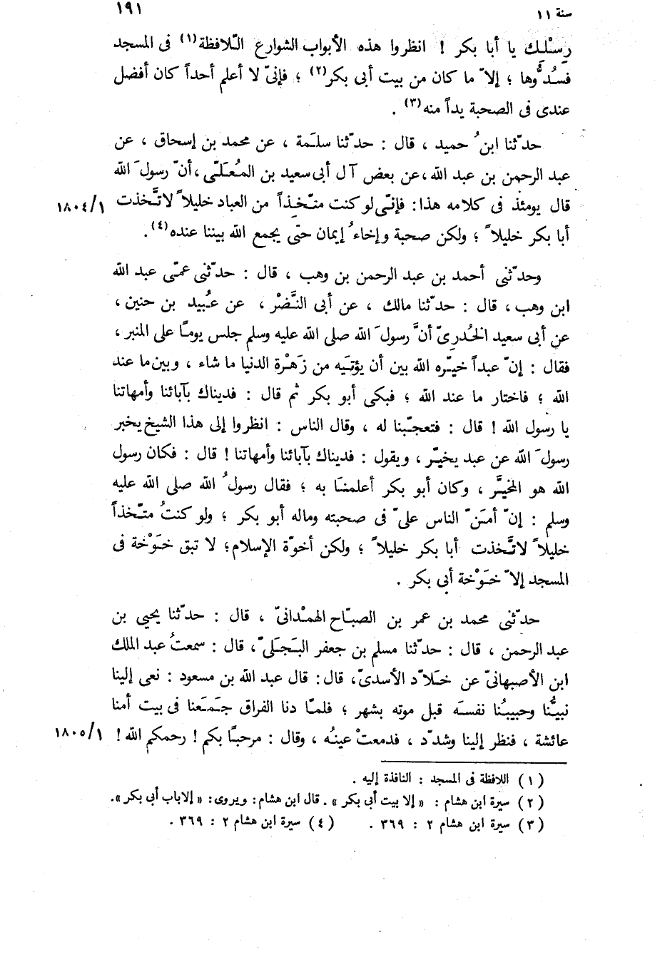 وَحَدَّثَنِي أَحْمَدُ بْنُ عَبْدِ الرَّحْمَنِ بْنِ وَهْبٍ، قَالَ: حَدَّثَنِي عَمِّي عبد الله ابن وَهْبٍ، قَالَ: حَدَّثَنَا مَالِكٌ، عَنْ أَبِي النَّضْرِ، عَنْ عُبَيْدِ بْنِ حُنَيْنٍ، عَنْ أَبِي سَعِيدٍ الخدرى ان رسول الله ص جَلَسَ يَوْمًا عَلَى الْمِنْبَرِ، [فَقَالَ: إِنَّ عَبْدًا خَيَّرَهُ اللَّهُ بَيْنَ أَنْ يُؤْتِيَهُ مِنْ زَهْرَةِ الدُّنْيَا مَا شَاءَ، وَبَيْنَ مَا عِنْدَ اللَّهِ، فَاخْتَارَ مَا عِنْدَ اللَّهِ،] فَبَكَى أَبُو بَكْرٍ ثُمَّ قَالَ: فَدَيْنَاكَ بِآبَائِنَا وَأُمَّهَاتِنَا يَا رَسُولَ اللَّهِ! قَالَ: فَتَعَجَّبْنَا لَهُ، وَقَالَ النَّاسُ: انْظُرُوا إِلَى هَذَا الشَّيْخِ يُخْبِرُ رَسُولَ اللَّهِ عَنْ عَبْدٍ يُخَيَّرُ، وَيَقُولُ: فَدَيْنَاكَ بِآبَائِنَا وَأُمَّهَاتِنَا! قَالَ: فَكَانَ رَسُولُ اللَّهِ هُوَ الْمُخَيَّرُ، وَكَانَ أَبُو بكر اعلمنا به، [فقال رسول الله ص: إِنَّ أَمَنَّ النَّاسِ عَلَيَّ فِي صُحْبَتِهِ وَمَالِهِ أَبُو بَكْرٍ، وَلَوْ كُنْتُ مُتَّخِذًا خَلِيلا لاتَّخَذْتُ أَبَا بَكْرٍ خَلِيلا، وَلَكِنْ أُخوَّةُ الإِسْلامِ، لا تَبْقَ خَوْخَةٌ فِي الْمَسْجِدِ إِلا خَوْخَةُ أَبِي بَكْرٍ] .