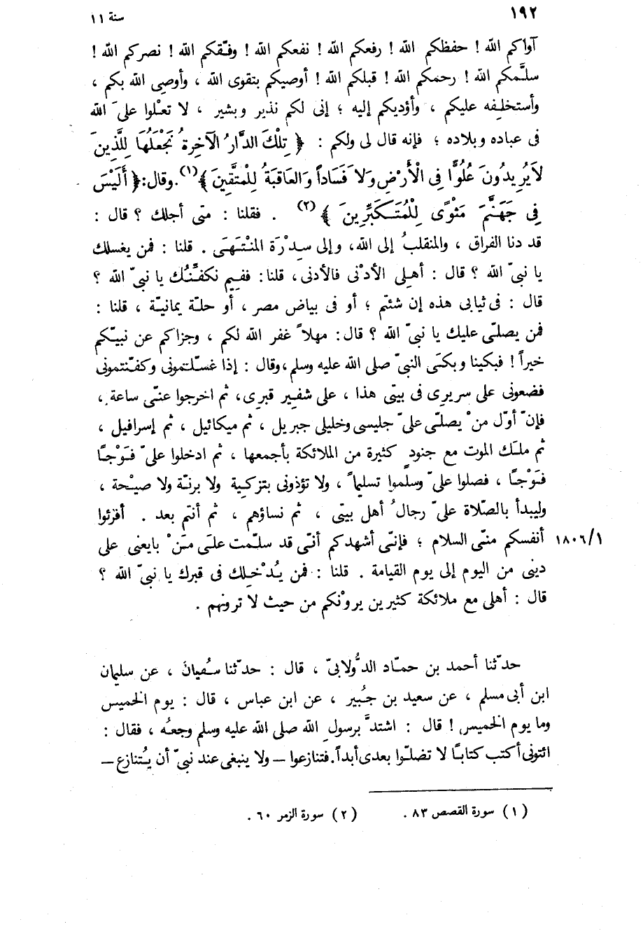آوَاكُمُ اللَّهُ! حَفِظَكُمُ اللَّهُ! رَفَعَكُمُ اللَّهُ! نَفَعَكُمُ اللَّهُ! وَفَّقَكُمُ اللَّهُ! نَصَرَكُمُ اللَّهُ! سَلَّمَكُمُ اللَّهُ! رَحِمَكُمُ اللَّهُ! قَبِلَكُمُ اللَّهُ! أُوصِيكُمْ بِتَقْوَى اللَّهِ، وَأُوصِي اللَّهُ بِكُمْ، وَأَسْتَخْلِفُهُ عَلَيْكُمْ، وَأُؤَدِّيكُمْ إِلَيْهِ، إِنِّي لَكُمْ نَذِيرٌ وَبَشِيرٌ، لا تَعْلُوا عَلَى اللَّهِ فِي عِبَادِهِ وَبِلادِهِ، فَإِنَّهُ قَالَ لِي وَلَكُمْ: «تِلْكَ الدَّارُ الْآخِرَةُ نَجْعَلُها لِلَّذِينَ لا يُرِيدُونَ عُلُوًّا فِي الْأَرْضِ وَلا فَساداً وَالْعاقِبَةُ لِلْمُتَّقِينَ» وقال: «أَلَيْسَ فِي جَهَنَّمَ مَثْوىً لِلْمُتَكَبِّرِينَ» فَقُلْنَا: مَتَى أَجَلُكَ؟ قَالَ: