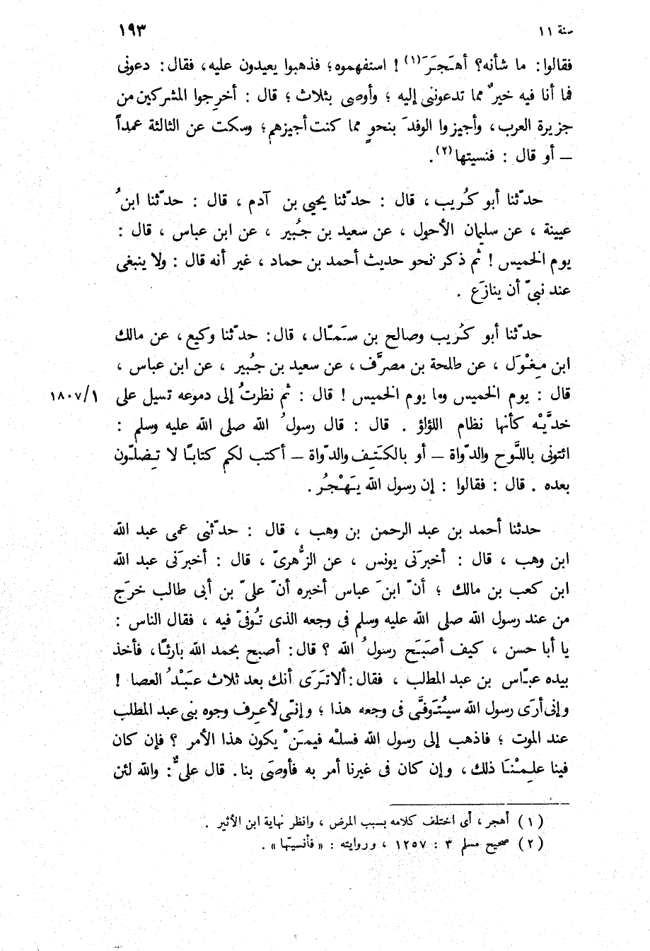 حَدَّثَنَا أَبُو كُرَيْبٍ وَصَالِحُ بْنُ سمال، قال: حدثنا وكيع، عن مالك ابن مِغْوَلٍ، عَنْ طَلْحَةَ بْنِ مُصَرِّفٍ، عَنْ سَعِيدِ بْنِ جُبَيْرٍ، عَنِ ابْنِ عَبَّاسٍ، قَالَ: يَوْمُ الْخَمِيسِ وَمَا يَوْمُ الْخَمِيسِ! قَالَ: ثُمَّ نَظَرْتُ إِلَى دُمُوعِهِ تَسِيلُ عَلَى خَدَّيْهِ كَأَنَّهَا نِظَامُ اللؤلؤ قال: [قال رسول الله ص: