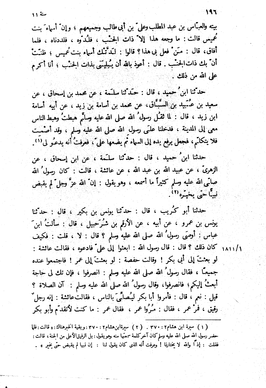 حَدَّثَنَا ابْنُ حُمَيْدٍ، قال: حَدَّثَنَا سلمة، عن محمد بن إسحاق، عَنْ سَعِيدِ بْنِ عُبَيْدِ بْنِ السَّبَّاقِ، عَنْ مُحَمَّدِ بْنِ أُسَامَةَ بْنِ زَيْدٍ، عَنْ أَبِيهِ اسامه ابن زيد، قال: لما ثقل رسول الله ص هَبَطْتُ وَهَبَطَ النَّاسُ مَعِي إِلَى الْمَدِينَةِ، فَدَخَلْنَا على رسول الله ص، وَقَدْ أُصْمِتَ فَلا يَتَكَلَّمُ، فَجَعَلَ يَرْفَعُ يَدَهُ إِلَى السَّمَاءِ ثُمَّ يَضَعُهَا عَلَيَّ، فَعَرَفْتُ أَنَّهُ يَدْعُو لِي.