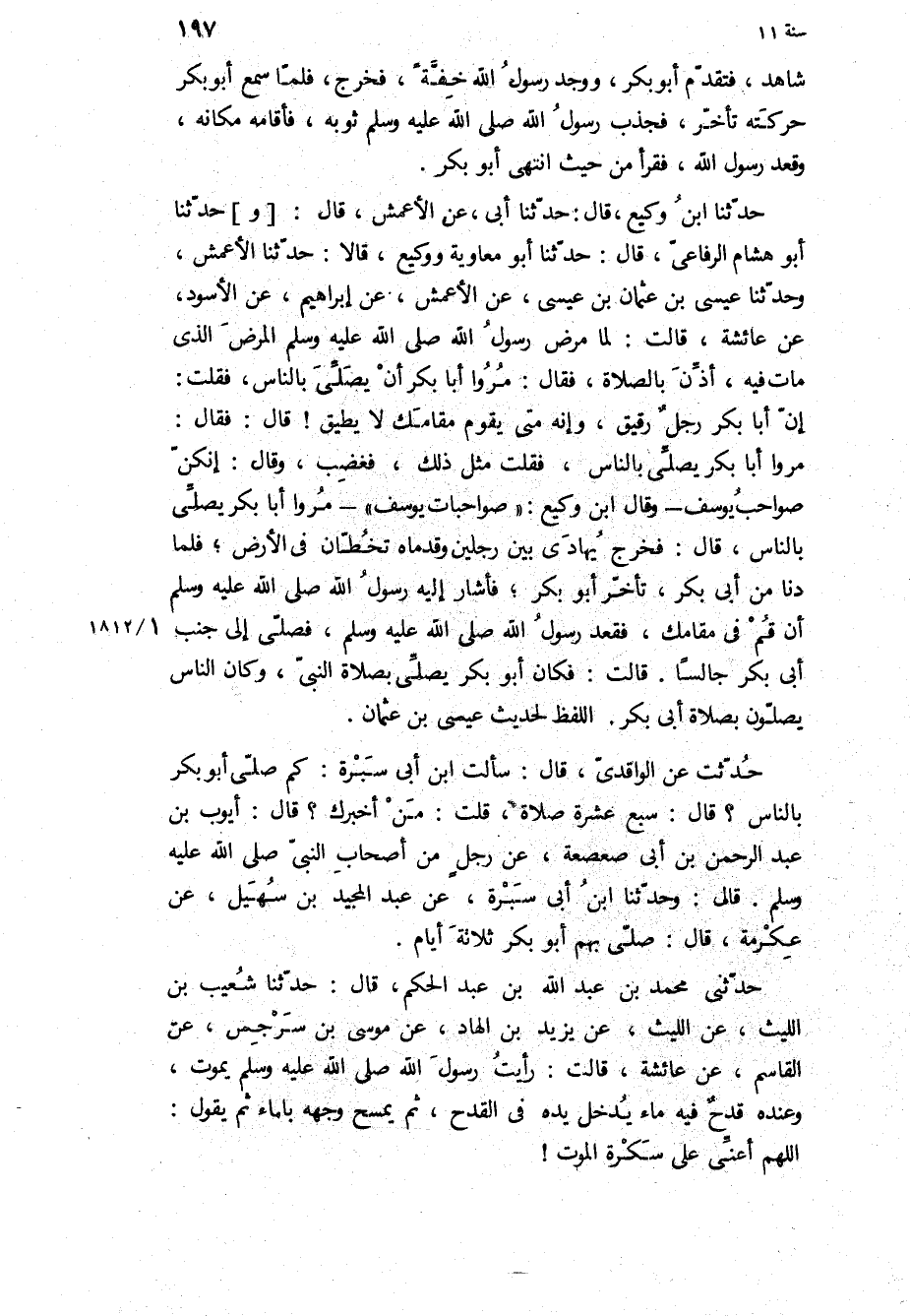 حَدَّثَنَا ابْنُ وَكِيعٍ، قَالَ: حَدَّثَنَا أَبِي، عَنِ الأَعْمَشِ، قَالَ: وَحَدَّثَنَا أَبُو هِشَامٍ الرِّفَاعِيُّ، قَالَ: حَدَّثَنَا أَبُو مُعَاوِيَةَ وَوَكِيعٌ، قَالا: حَدَّثَنَا الأَعْمَشُ، وَحَدَّثَنَا عِيسَى بْنُ عُثْمَانَ بْنِ عِيسَى، عَنِ الأَعْمَشِ، عَنْ إِبْرَاهِيمَ، عَنِ الأَسْوَدِ، عَنْ عَائِشَةَ، قَالَتْ: [لَمَّا مرض رسول الله ص الْمَرَضَ الَّذِي مَاتَ فِيهِ، أُذِّنَ بِالصَّلاةِ، فَقَالَ: مُرُوا أَبَا بَكْرٍ أَنْ يُصَلِّيَ بِالنَّاسِ، فَقُلْتُ: