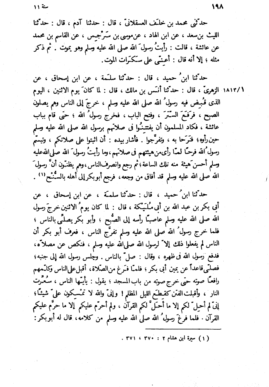 حَدَّثَنَا ابْنُ حميد، قال: حَدَّثَنَا سلمة، عن ابن إسحاق، عَنِ الزُّهْرِيِّ، قَالَ: حَدَّثَنَا أَنَسُ بْنُ مَالِكٍ، قَالَ: لَمَّا كَانَ يَوْمُ الاثْنَيْنِ، الْيَوْمُ الَّذِي قبض فيه رسول الله ص، خَرَجَ إِلَى النَّاسِ وَهُمْ يُصَلُّونَ الصُّبْحَ، فَرَفَعَ السِّتْرَ، وَفَتَحَ الْبَابَ، فَخَرَجَ رَسُولُ اللَّهِ، حَتَّى قَامَ بِبَابِ عَائِشَةَ، فَكَادَ الْمُسْلِمُونَ أَنْ يَفْتَتِنُوا في صلاتهم برسول الله ص حِينَ رَأَوْهُ، فَرَحًا بِهِ، وَتَفَرَّجُوا فَأَشَارَ بِيَدِهِ: أَنِ اثْبُتُوا عَلَى صَلاتِكُمْ، وَتَبَسَّمَ رَسُولُ اللَّهِ فَرَحًا لَمَّا رَأَى مِنْ هَيْئَتِهِمْ فِي صَلاتِهِمْ، وما رايت رسول الله ص أَحْسَنَ هَيْئَةً مِنْهُ تِلْكَ السَّاعَةَ، ثُمَّ رَجَعَ وَانْصَرَفَ النَّاسُ، وَهُمْ يَظُنُّونَ أَنَّ رَسُولَ اللَّهِ ص قَدْ أَفَاقَ مِنْ وَجَعِهِ، فَرَجَعَ أَبُو بَكْرٍ إِلَى أَهْلِهِ بِالسُّنْحِ.