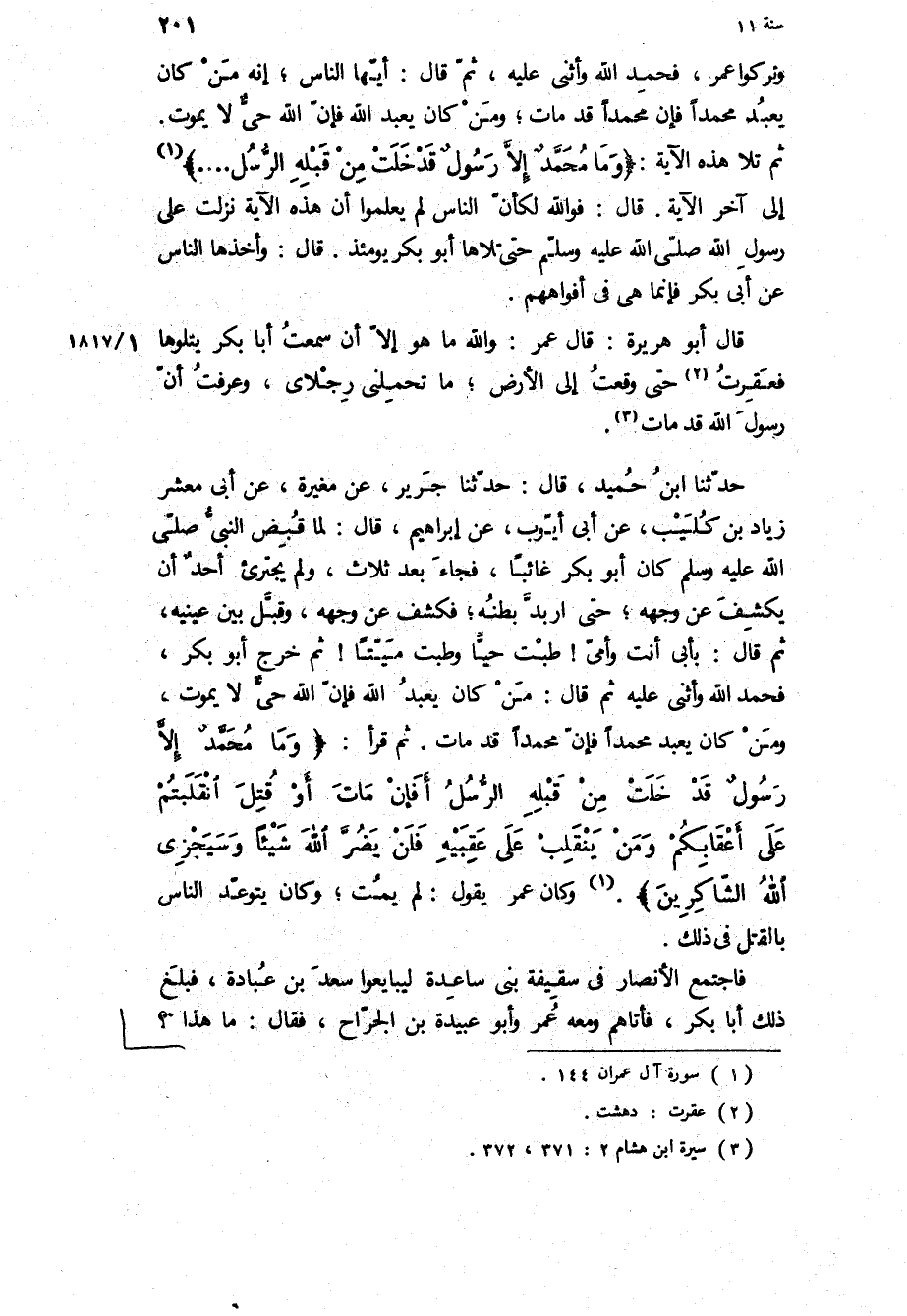 ثُمَّ تَلا هَذِهِ الآيَةَ: «وَما مُحَمَّدٌ إِلَّا رَسُولٌ قَدْ خَلَتْ مِنْ قَبْلِهِ الرُّسُلُ» الى آخر الآية قال: فو الله لَكَأَنَّ النَّاسَ لَمْ يَعْلَمُوا أَنَّ هَذِهِ الآيَةَ نزلت على رسول الله ص حَتَّى تَلاهَا أَبُو بَكْرٍ يَوْمَئِذٍ قَالَ: وَأَخَذَهَا النَّاسُ عَنْ أَبِي بَكْرٍ فَإِنَّمَا هِيَ فِي أَفْوَاهِهِمْ.