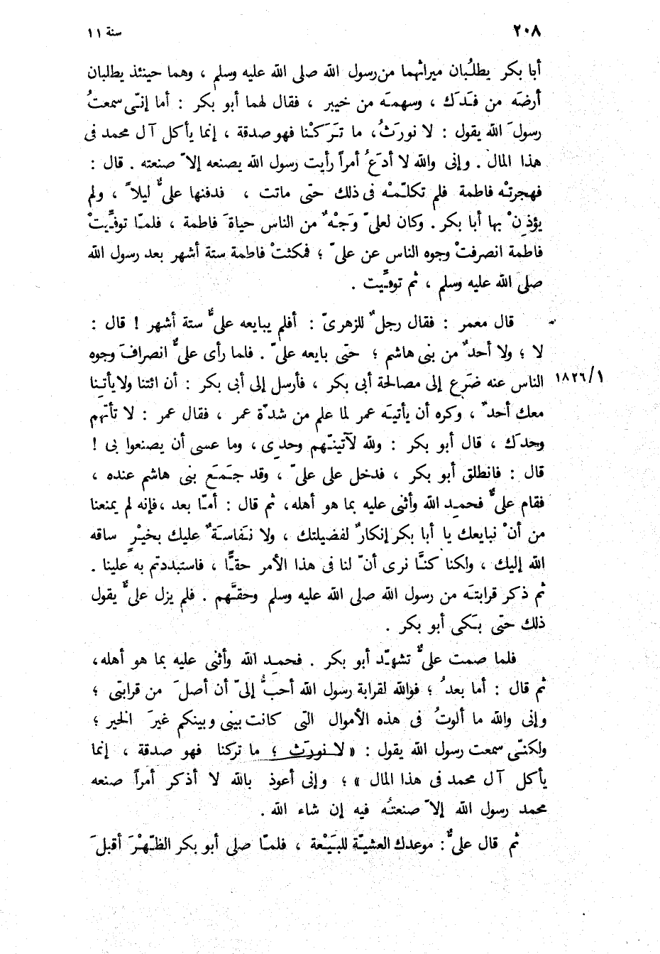 أَبَا بَكْرٍ يَطْلُبَانِ مِيرَاثَهُمَا مِنْ رَسُولِ اللَّهِ ص، وَهُمَا حِينَئِذٍ يَطْلُبَانِ أَرْضَهُ مِنْ فَدَكٍ، وَسَهْمَهُ مِنْ خَيْبَرَ، فَقَالَ لَهُمَا أَبُو بَكْرٍ: أَمَا انى سمعت رسول الله يَقُولُ: [لا نُوَرَّثُ، مَا تَرَكْنَا فَهُوَ صَدَقَةٌ، إِنَّمَا يَأْكُلُ آلُ مُحَمَّدٍ فِي هَذَا الْمَالِ] وَإِنِّي وَاللَّهِ لا أَدَعُ أَمْرًا رَأَيْتُ رَسُولَ الله يَصْنَعُهُ إِلا صَنَعْتُهُ قَالَ: