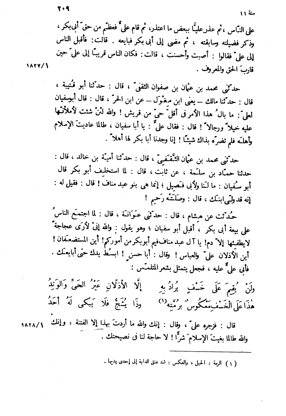 حَدَّثَنِي مُحَمَّدُ بْنُ عُثْمَانَ بْنِ صَفْوَانَ الثَّقَفِيُّ، قَالَ: حَدَّثَنَا أَبُو قُتَيْبَةَ، قَالَ: حَدَّثَنَا مالك- يعنى ابن مغول- عن ابن الحر، قَالَ: قَالَ أَبُو سُفْيَانَ لِعَلِيٍّ: مَا بَالُ هَذَا الأَمْرِ فِي أَقَلِّ حَيٍّ مِنْ قُرَيْشٍ! وَاللَّهِ لَئِنْ شِئْتَ لأَمْلأَنَّهَا عَلَيْهِ خَيْلا وَرِجَالا! قَالَ: [فَقَالَ عَلِيٌّ: يَا أَبَا سُفْيَانَ، طَالَمَا عَادَيْتَ الإِسْلامَ وَأَهْلَهُ فَلَمْ تَضُرَّهُ بِذَاكَ شَيْئًا! إِنَّا وَجَدْنَا أَبَا بَكْرٍ لَهَا أَهْلا] .