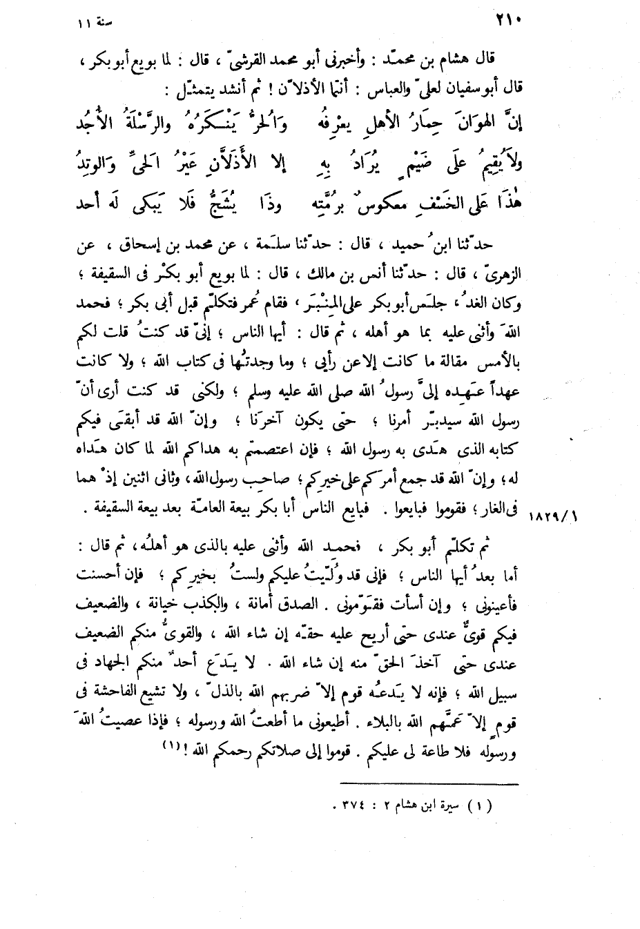 حَدَّثَنَا ابْنُ حميد، قال: حَدَّثَنَا سلمة، عن محمد بن إِسْحَاقَ، عَنِ الزُّهْرِيِّ، قَالَ: حَدَّثَنَا أَنَسُ بْنُ مَالِكٍ، قَالَ: لَمَّا بُويِعَ أَبُو بَكْرٍ فِي السَّقِيفَةِ، وَكَانَ الْغَدُ، جَلَسَ أَبُو بَكْرٍ عَلَى الْمِنْبَرِ، فَقَامَ عُمَرُ فَتَكَلَّمَ قَبْلَ أَبِي بَكْرٍ، فَحَمِدَ اللَّهَ وَأَثْنَى عَلَيْهِ بِمَا هُوَ أَهْلُهُ، ثُمَّ قَالَ: أَيُّهَا النَّاسُ، إِنِّي قَدْ كُنْتُ قُلْتُ لَكُمْ بِالأَمْسِ مَقَالَةً مَا كَانَتْ إِلا عَنْ رَأْيِي، وَمَا وَجَدْتُهَا فِي كِتَابِ اللَّهِ، وَلا كَانَتْ عَهْدًا عَهِدَهُ إِلَيَّ رَسُولُ اللَّهِ ص، وَلَكِنِّي قَدْ كُنْتُ أَرَى أَنَّ رَسُولَ اللَّهِ سَيُدبِرُ أَمْرَنَا، حَتَّى يَكُونَ آخِرَنَا، وَإِنَّ اللَّهَ قَدْ أَبْقَى فِيكُمْ كِتَابَهُ الَّذِي هَدَى بِهِ رَسُولَ اللَّهِ، فَإِنِ اعْتَصَمْتُمْ بِهِ هَدَاكُمُ اللَّهُ لِمَا كَانَ هَدَاهُ لَهُ، وَإِنَّ اللَّهَ قَدْ جَمَعَ أَمْرَكُمْ عَلَى خَيْرِكُمْ، صَاحِبَ رَسُولِ اللَّهِ، وثانِيَ اثْنَيْنِ إِذْ هُما فِي الْغارِ، فَقُومُوا فَبَايِعُوا فَبَايَعَ النَّاسُ أَبَا بَكْرٍ بَيْعَةَ الْعَامَّةِ بَعْدَ بَيْعَةِ السَّقِيفَةِ.